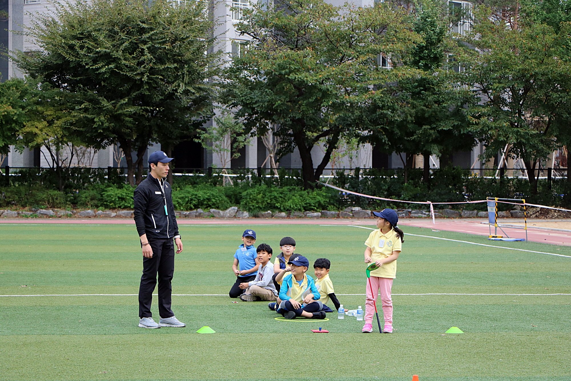 먼저 실습한 친구가 자신이 친 볼을 수거해 오는 동안 안전을 위해 헤드를 잡고 기다리고 있는 모습