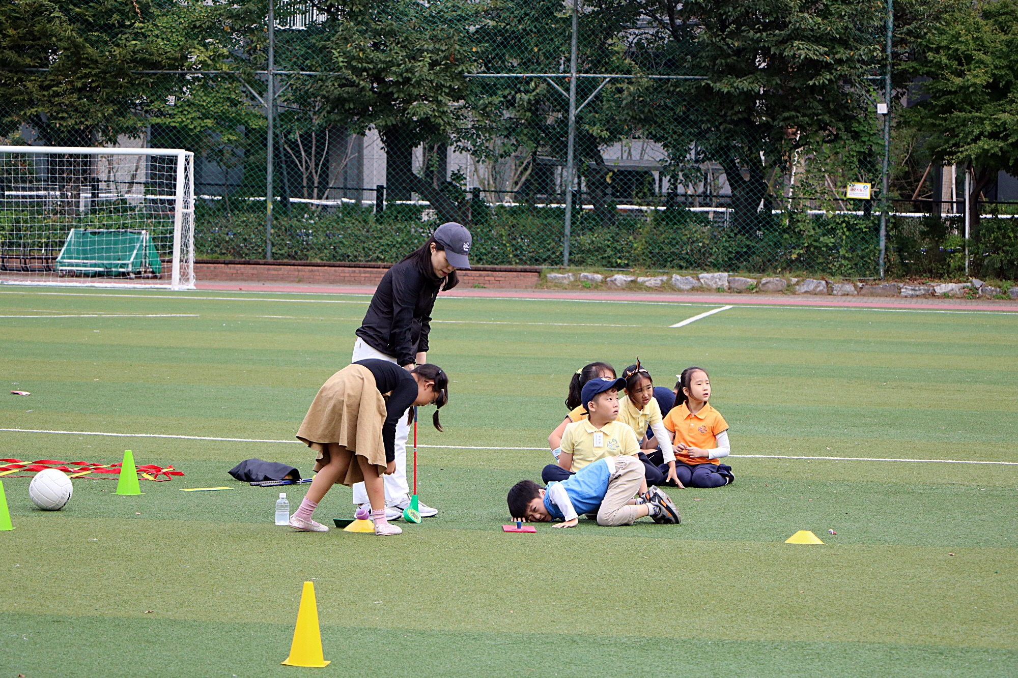운동장에 엎드려서 신중하게 라이를 보고 있는 모습