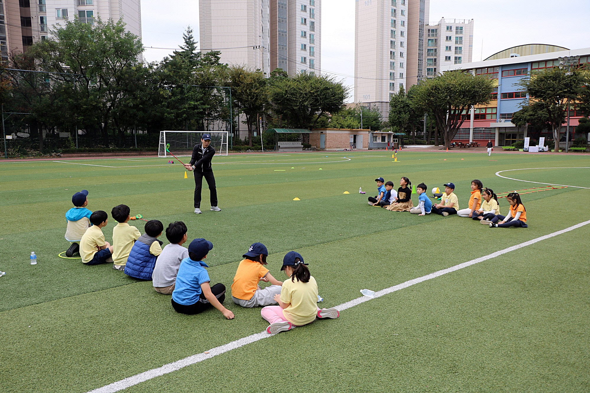 L to L 스윙에 대해서 아이들에게 시범을 보이고 있는 코치님