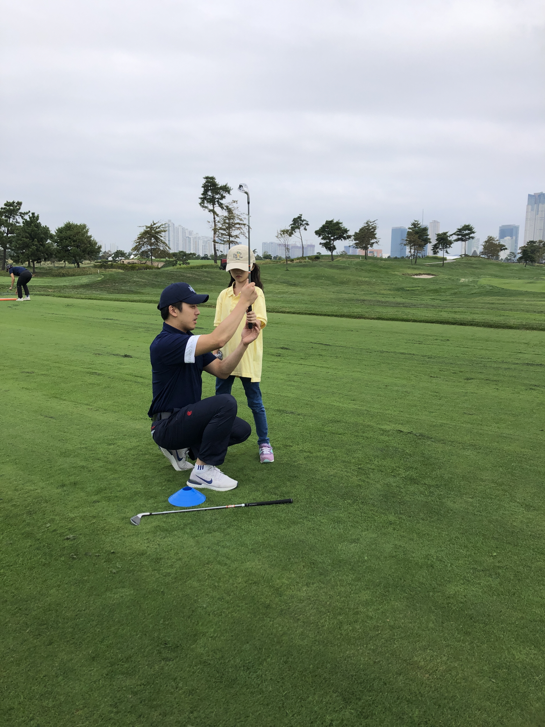 코치님께 클럽 잡는 방법에 대해 지도 받고 있는 모습