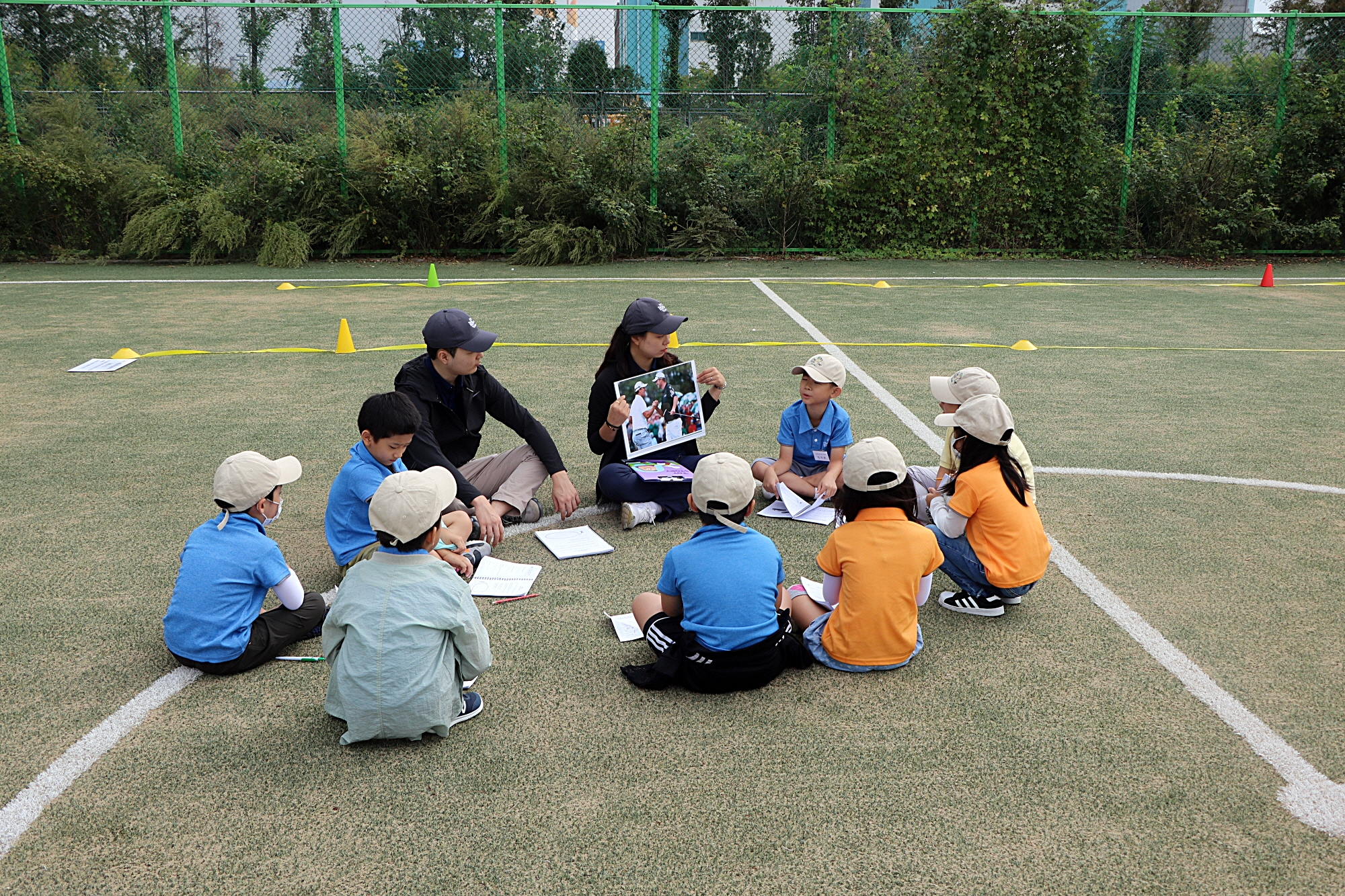 골프라운드시 어떻게 동반자에게 스포츠맨십을 보여줄 수 있는지에 대해 설명해 주고 있는 모습