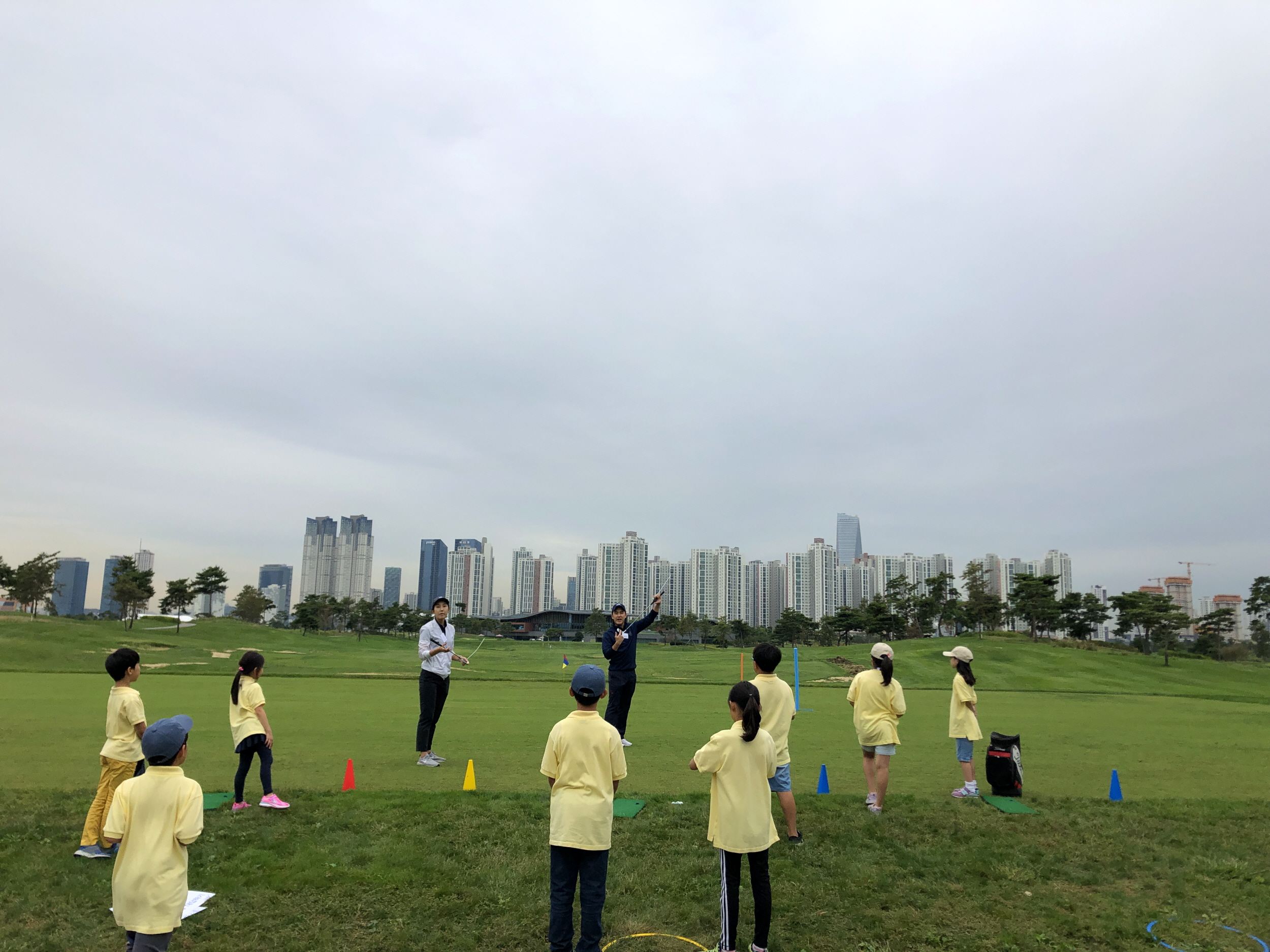 코치님과 함께 지난 시간에 배운 골프클럽에 대해 이야기 해보는 모습