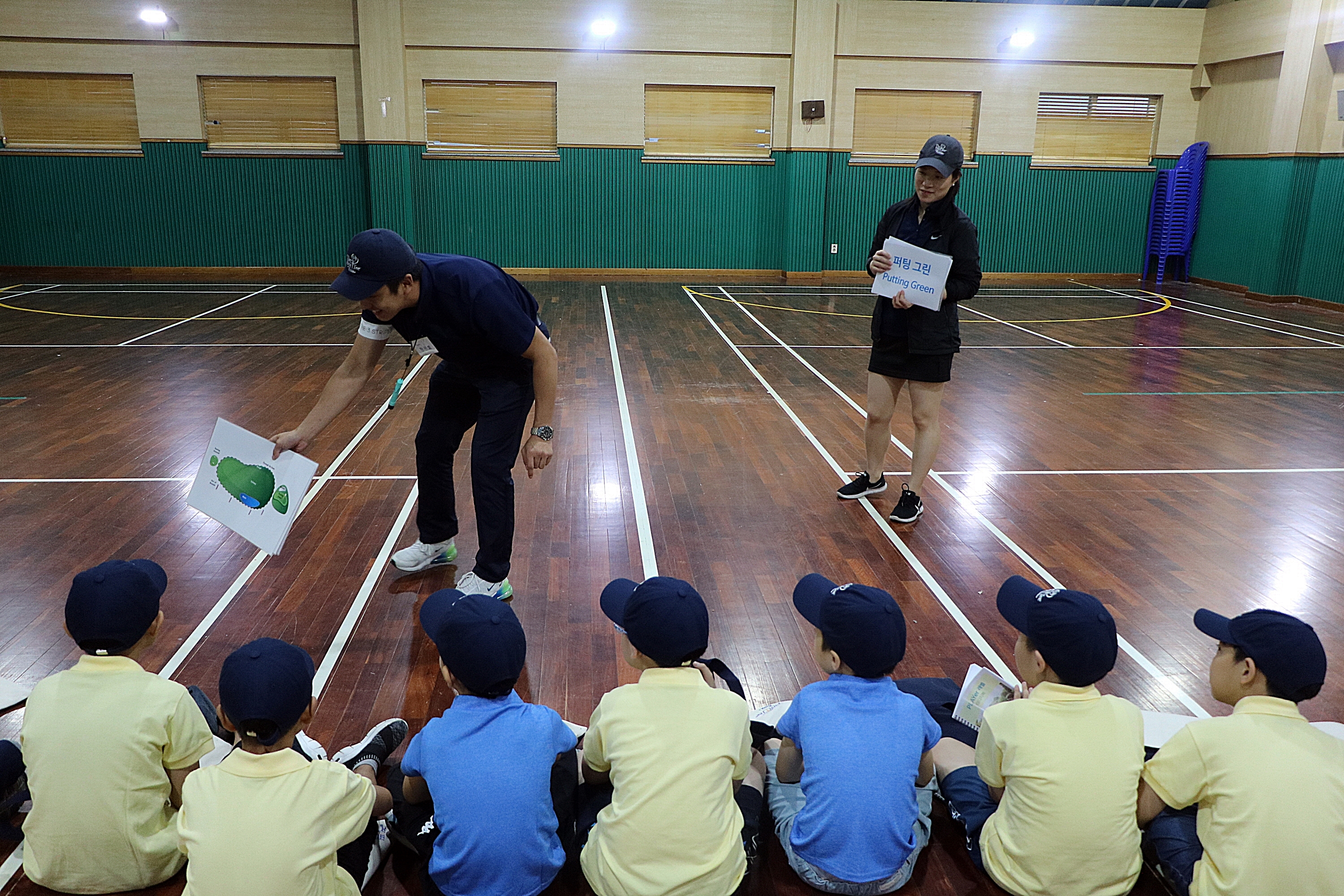 골프코스 명칭 중 퍼팅 그린에 대해서 설명해 주고 있는 모습