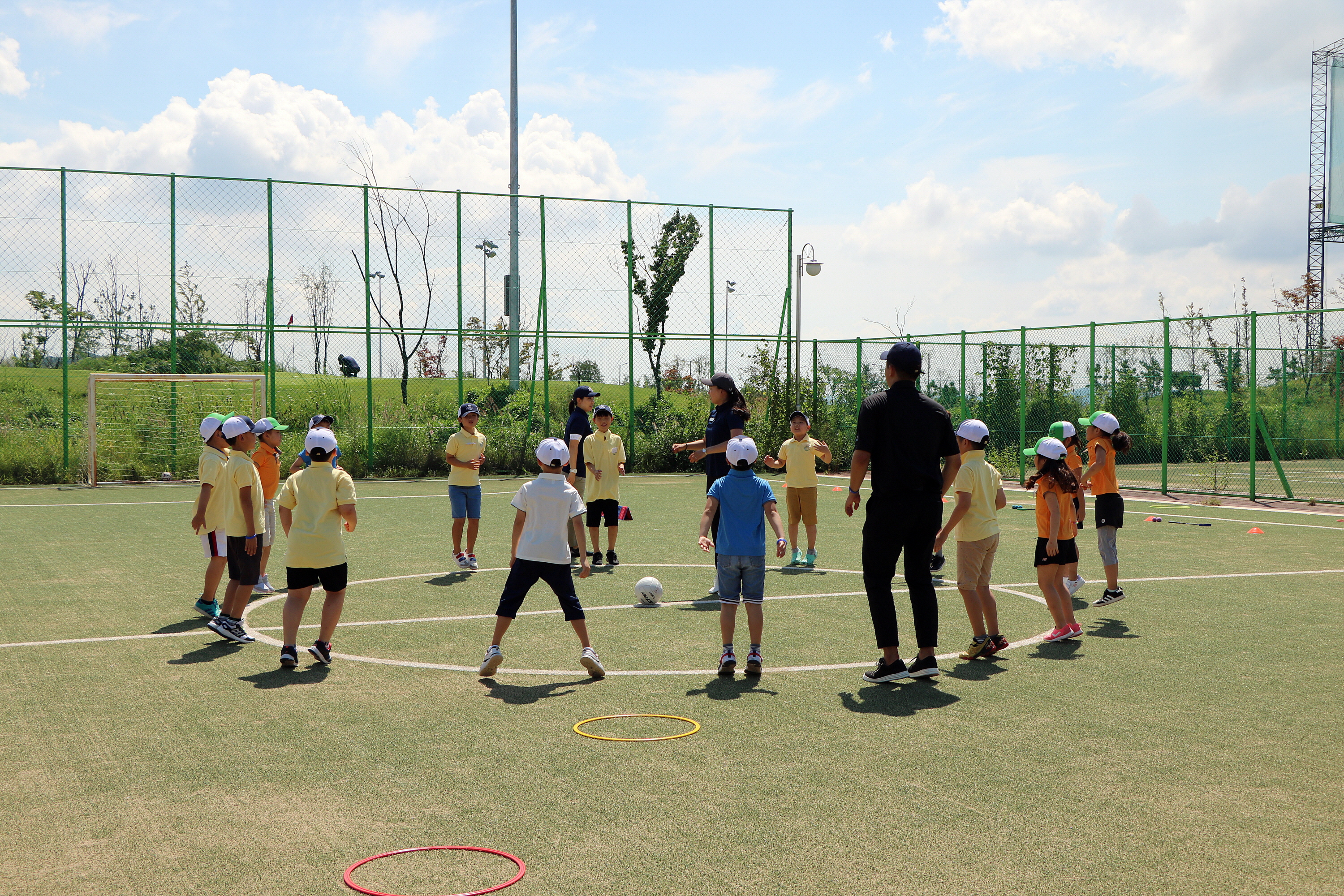 코치님의 구령에 맞춰 제자리 높이 뛰기를 하면서 몸을 풀고 있는 모습