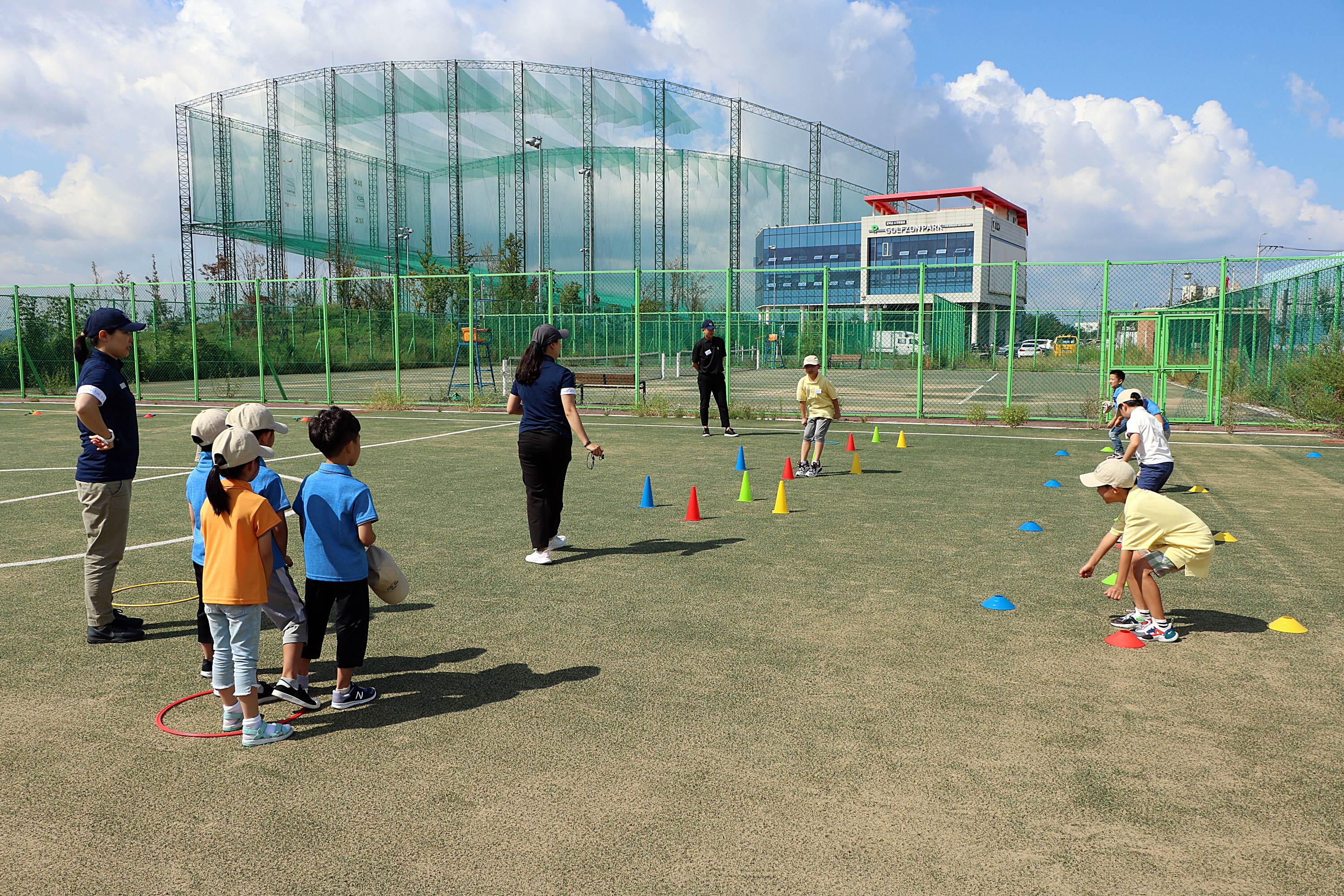 코치님의 구령에 맞춰 색깔별로 표시된 자리로 두발을 모으고 점프하는 게임을 하고 있는 모습