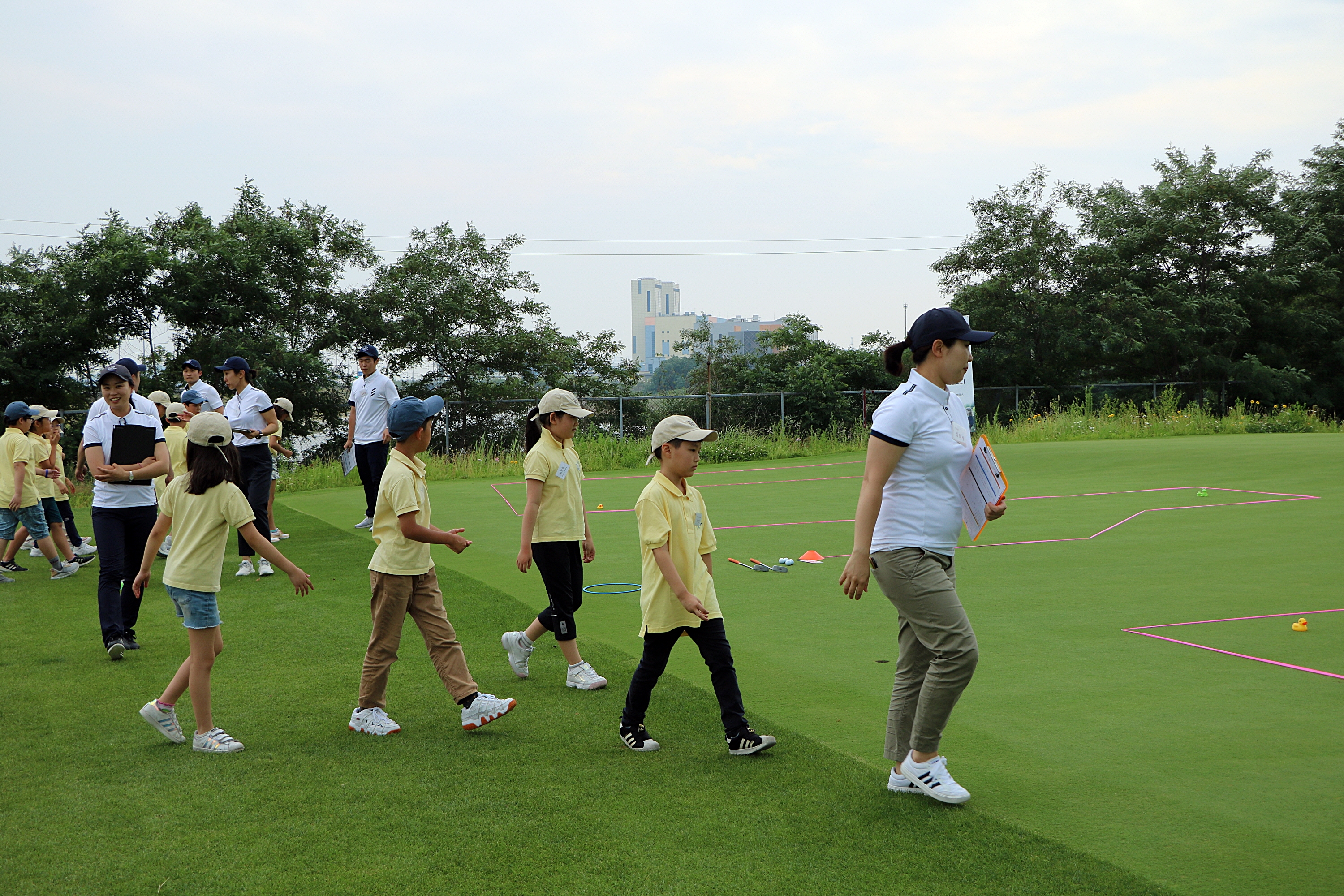 각 조별로 퍼팅게임을 하기 위해 코치님과 함께 이동 중인 아이들