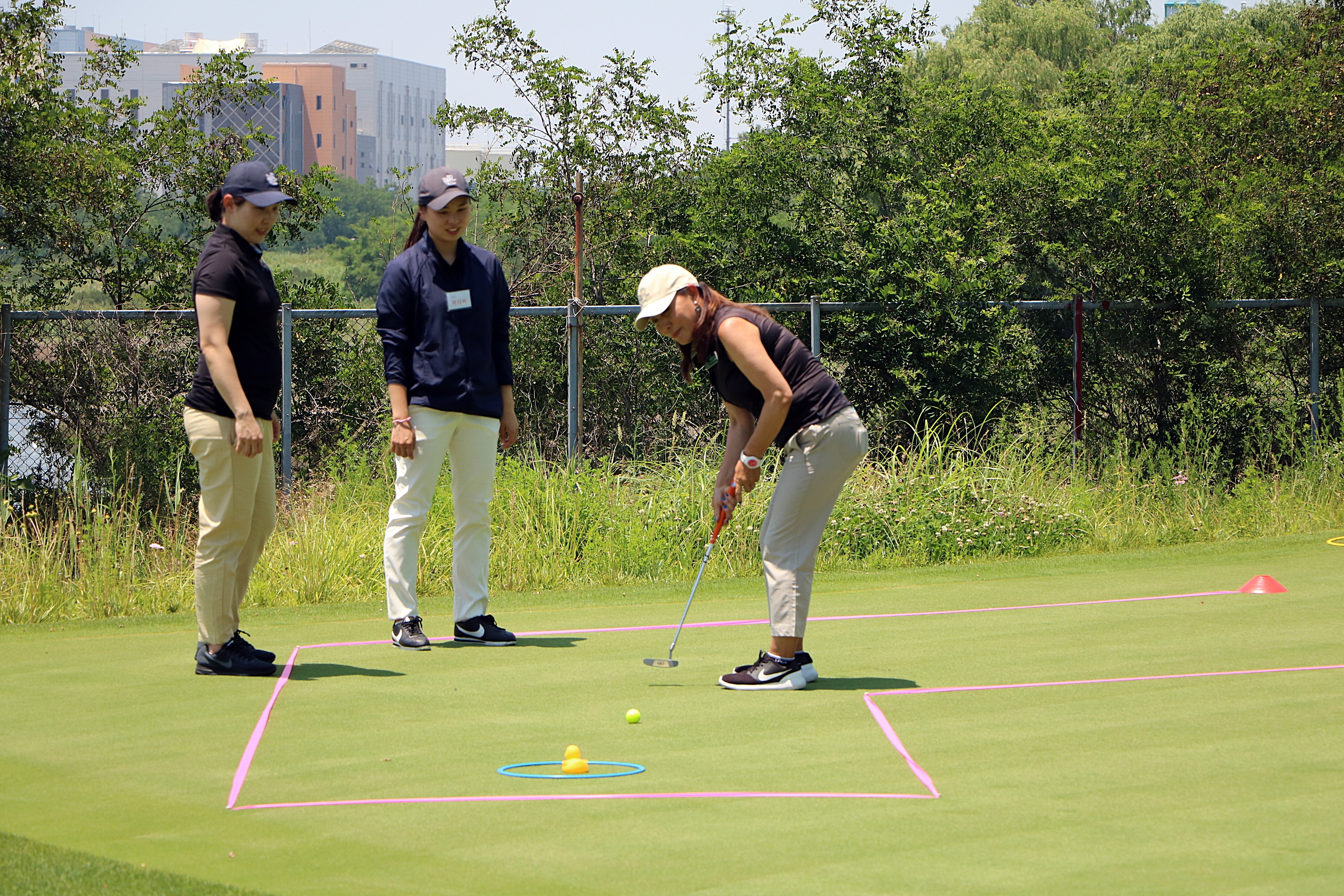교육생과 코치의 역할을 바꿔 교육생의 입장으로 퍼팅게임에 참여하고 있는 모습