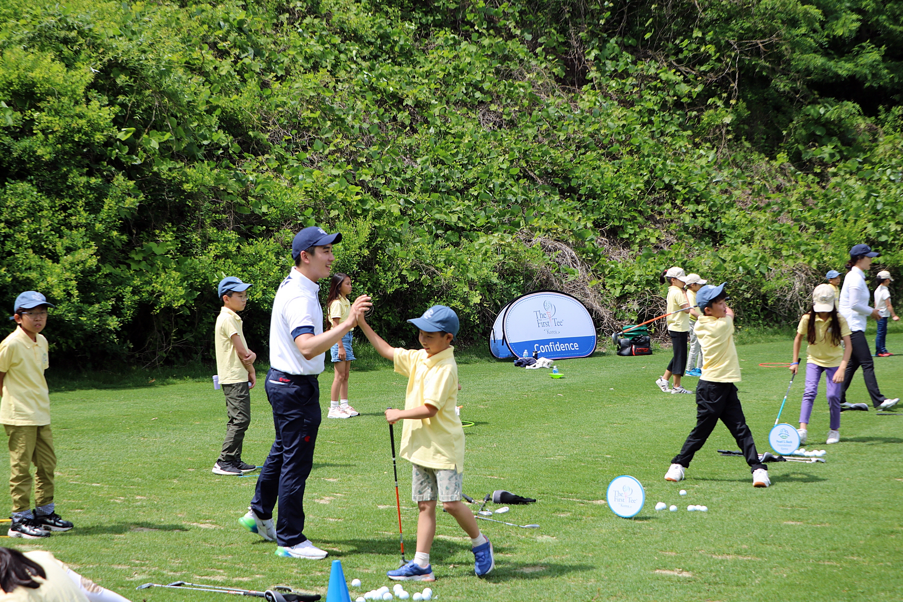 코치님과 하이파이브를 하며 즐거워하고 있는 아이들