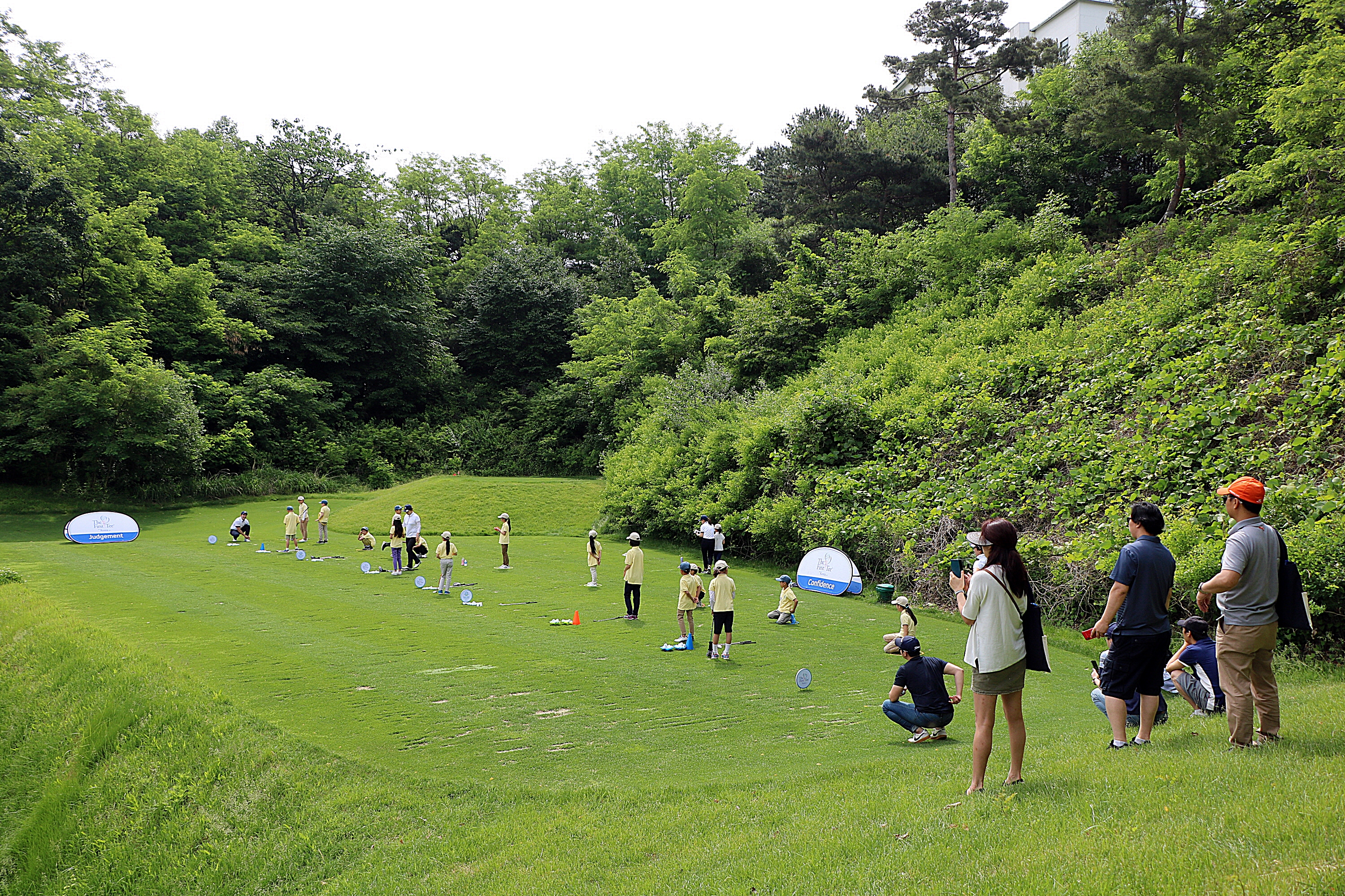 실제로 잔디 위에서 우드샷과 아이언 샷을 실습해보고 있는 아이들