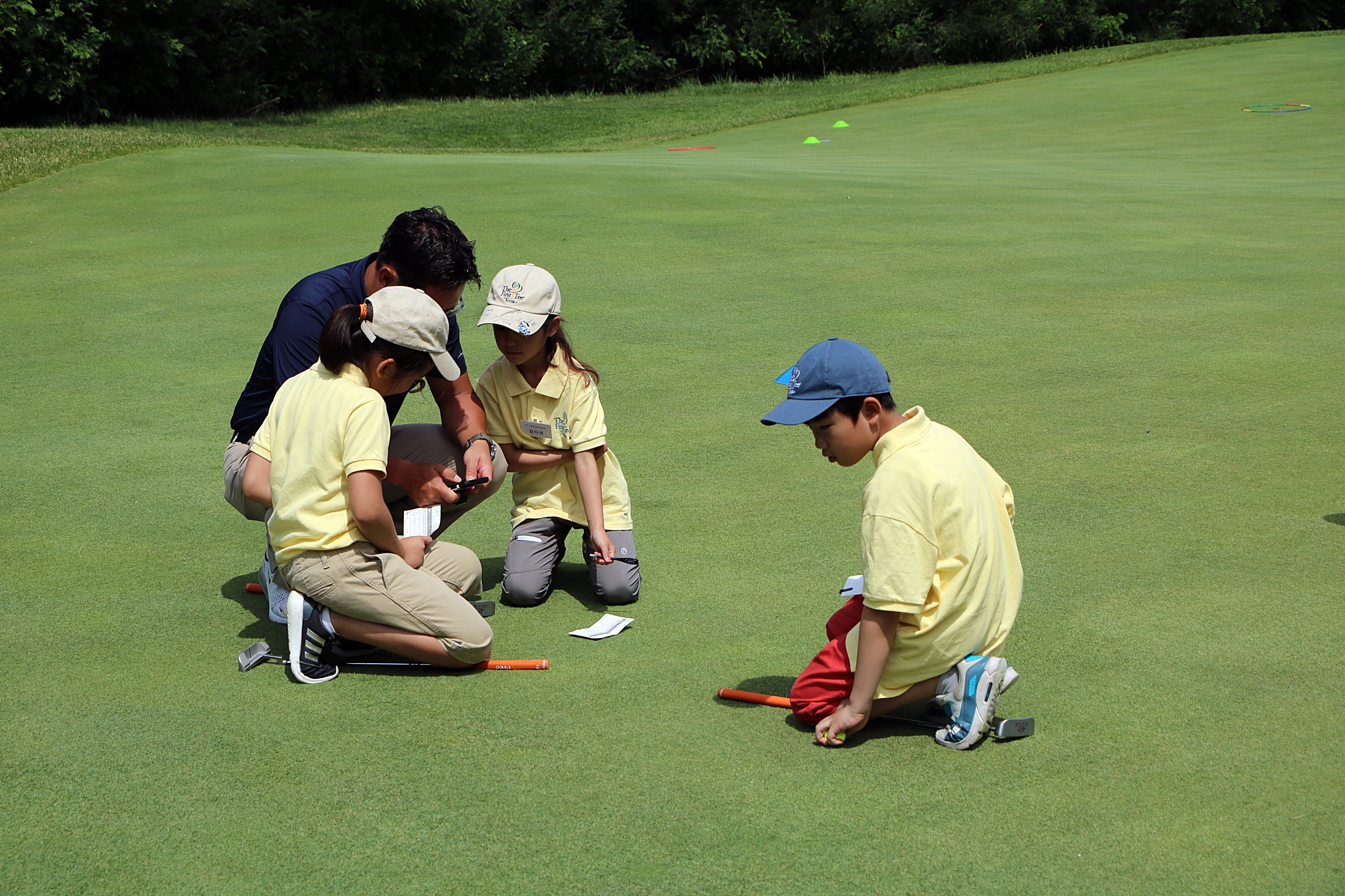 스마트폰을 이용해 9홀 전체 스코어를 합산해 주고 있는 남영우 프로