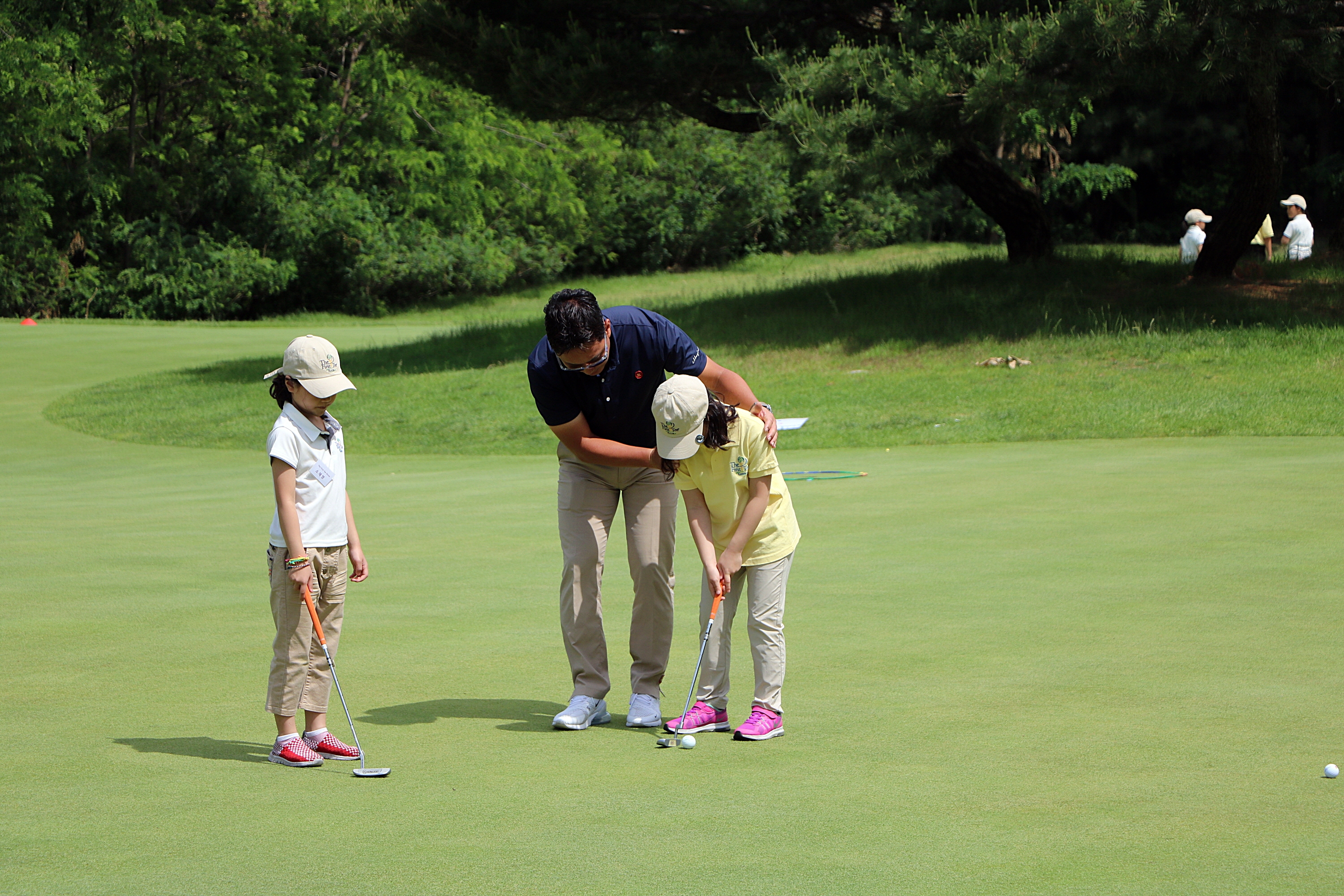 퍼트시 올바른 셋업 자세를 설명하며 자세를 교정해 주고 있는 모습