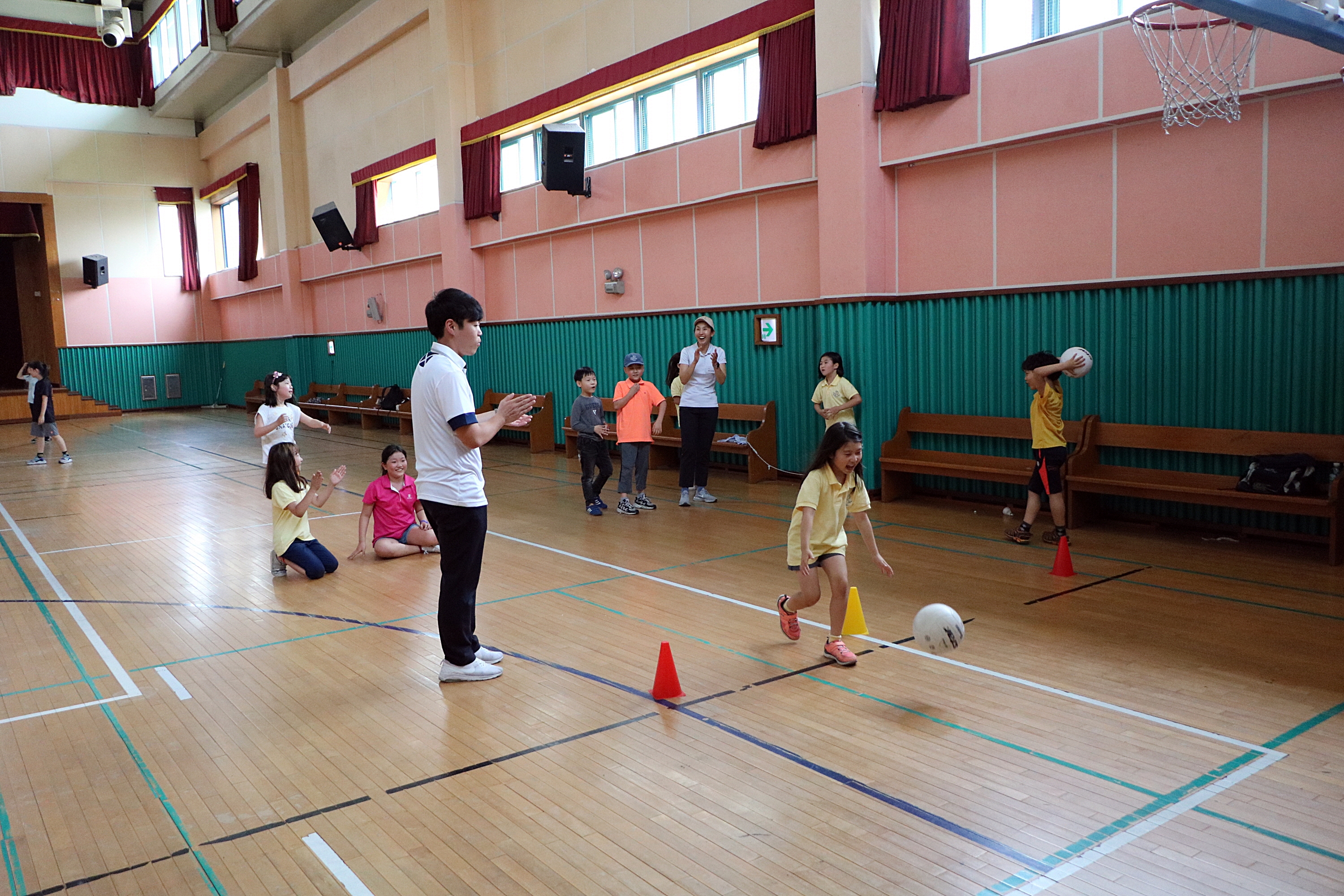 거리에 따른 스윙크기의 개념을 알려주기 위해 농구 자유투 시합을 하고 있는 아이들