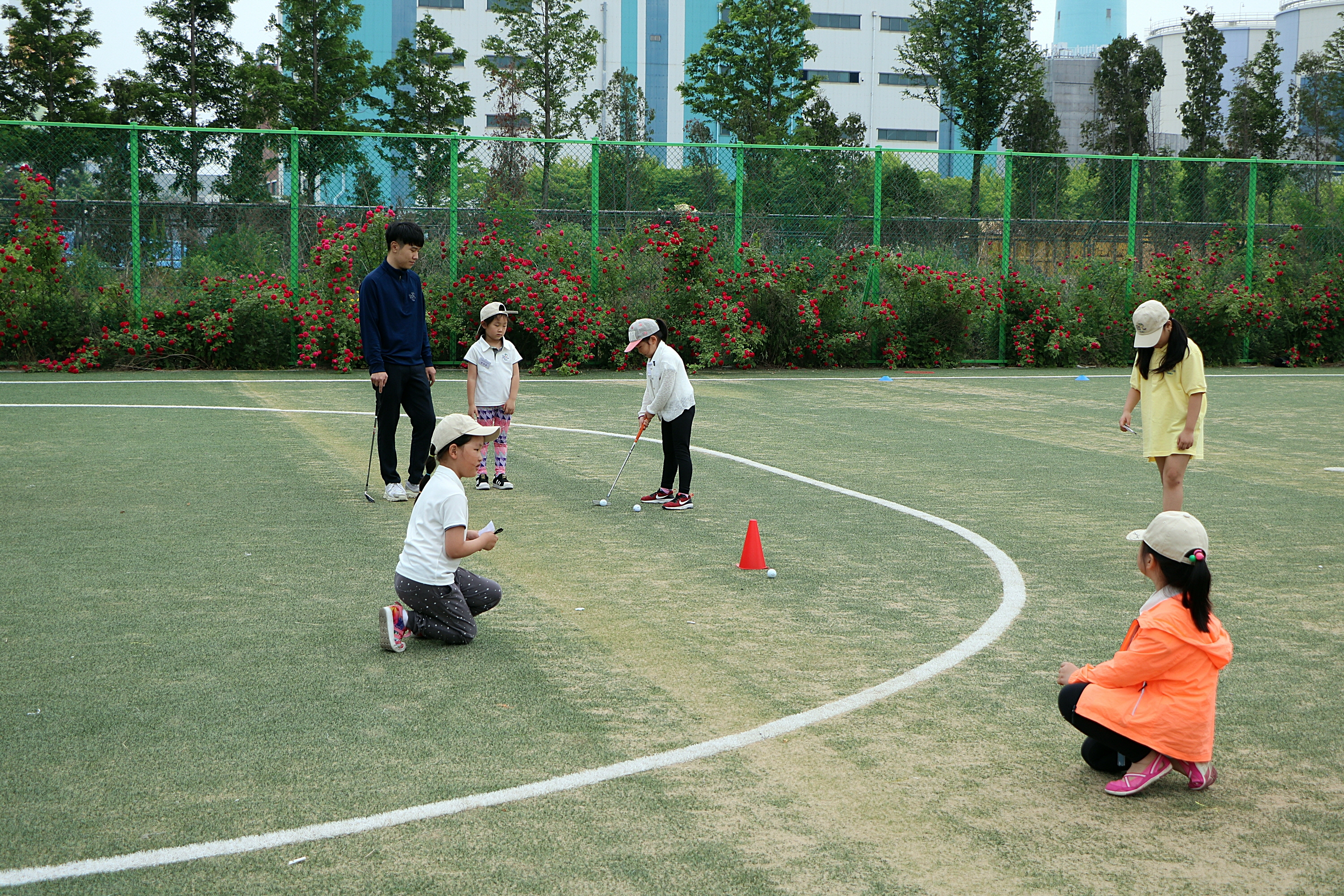 원구선타의 골프룰을 준수하며 코치님이 지켜보는 가운데 신중하게 플레이에 임하고 있는 아이들