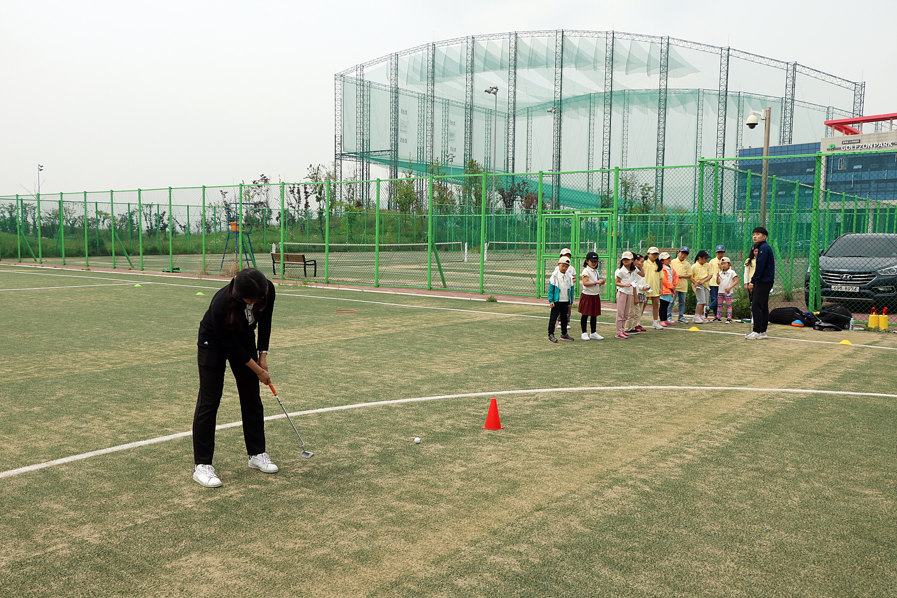 홀인 방법에 대한 코치님의 시범을 지켜보고 있는 아이들