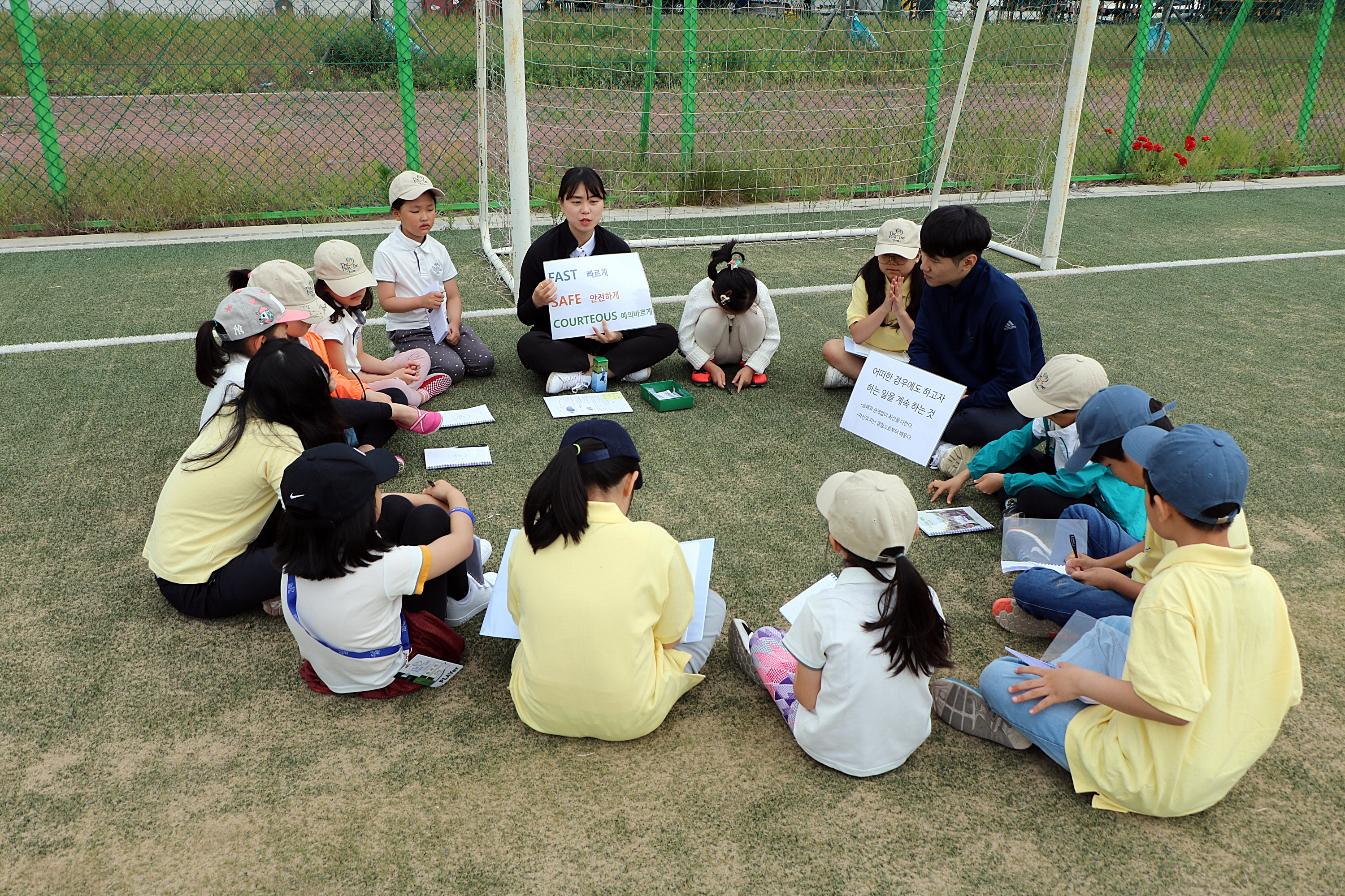 다음주 통합 수업인 실전라운드를 앞두고 플레이 시 유의해야 할 사항에 대해 듣고 있는 아이들