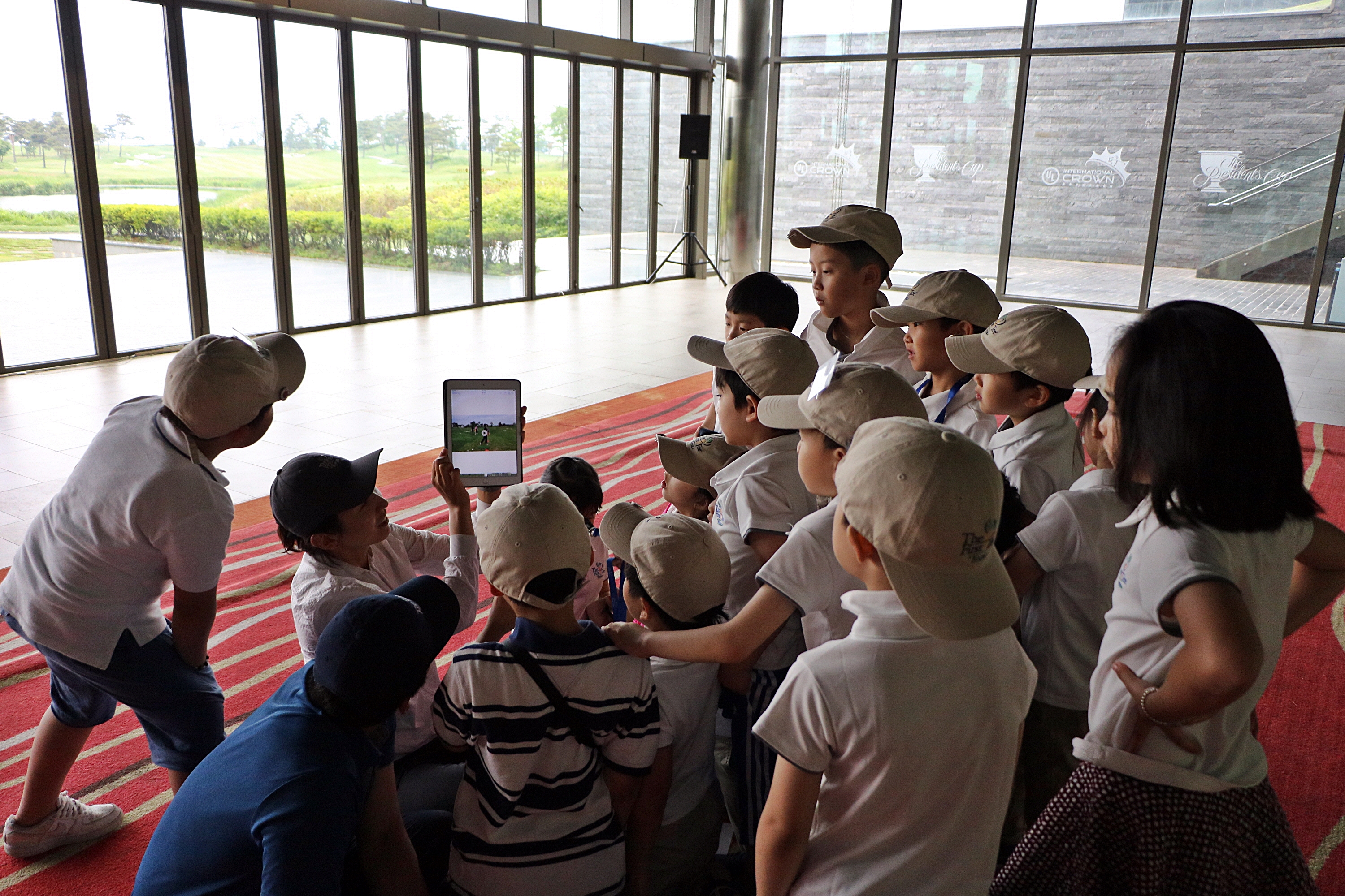 다른 반의 모범 스윙사례를 보여주면서 본인의 스윙과 비교할 수 있도록 도와주고 있는 모습