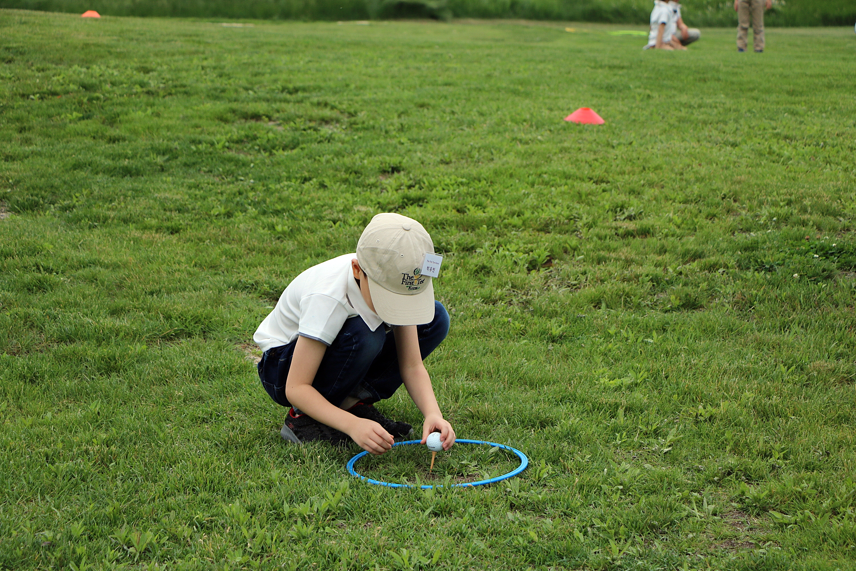 골프실습 때 필요한 실제 골프티에 공을 올려놓는 것을 연습해보고 있는 아이들