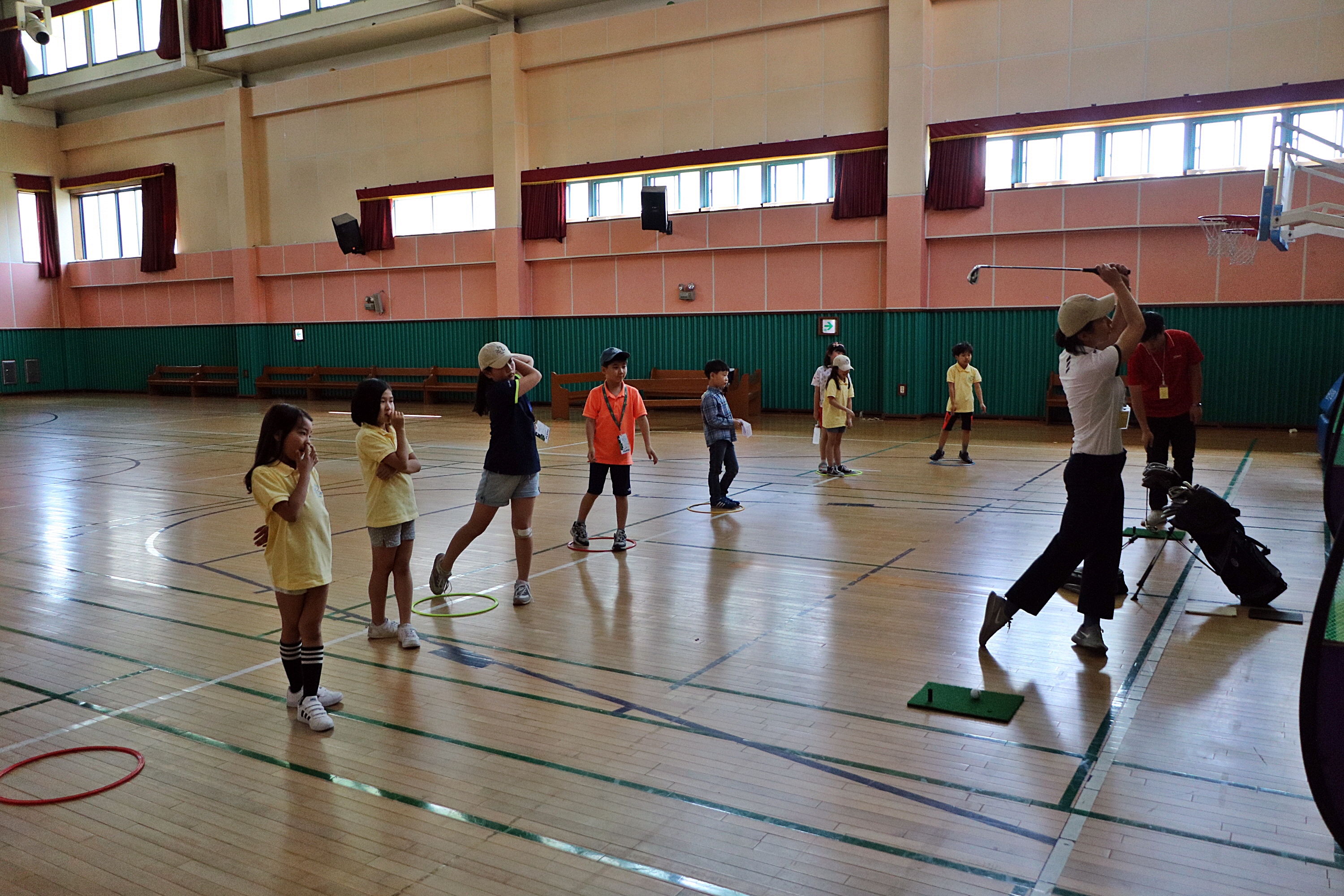L to L스윙 실습을 앞두고 아이들에게 시범을 보여주고 있는 모습