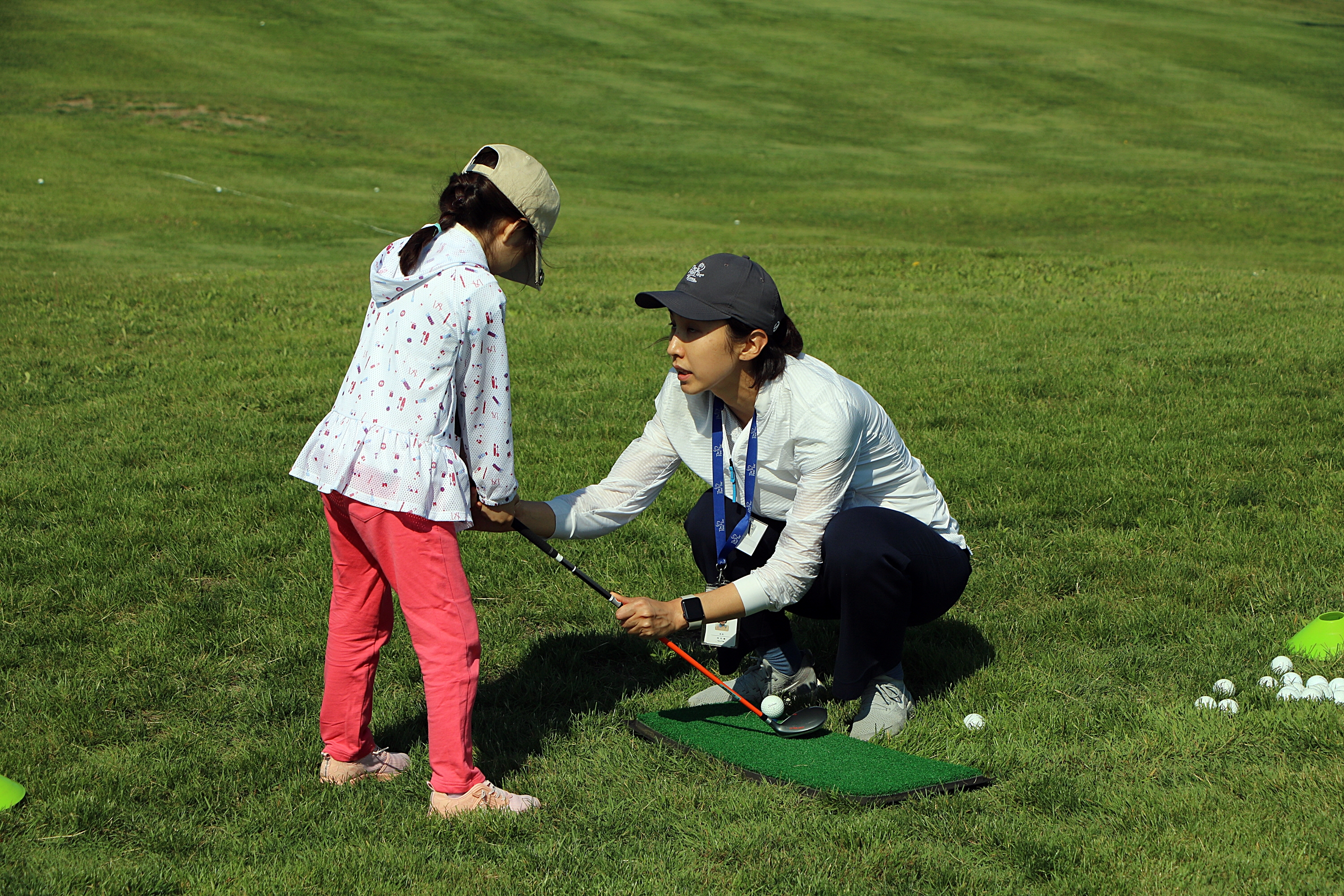 우드샷 시 몸과 볼의 간격에 대해서 설명해 주고 있는 모습