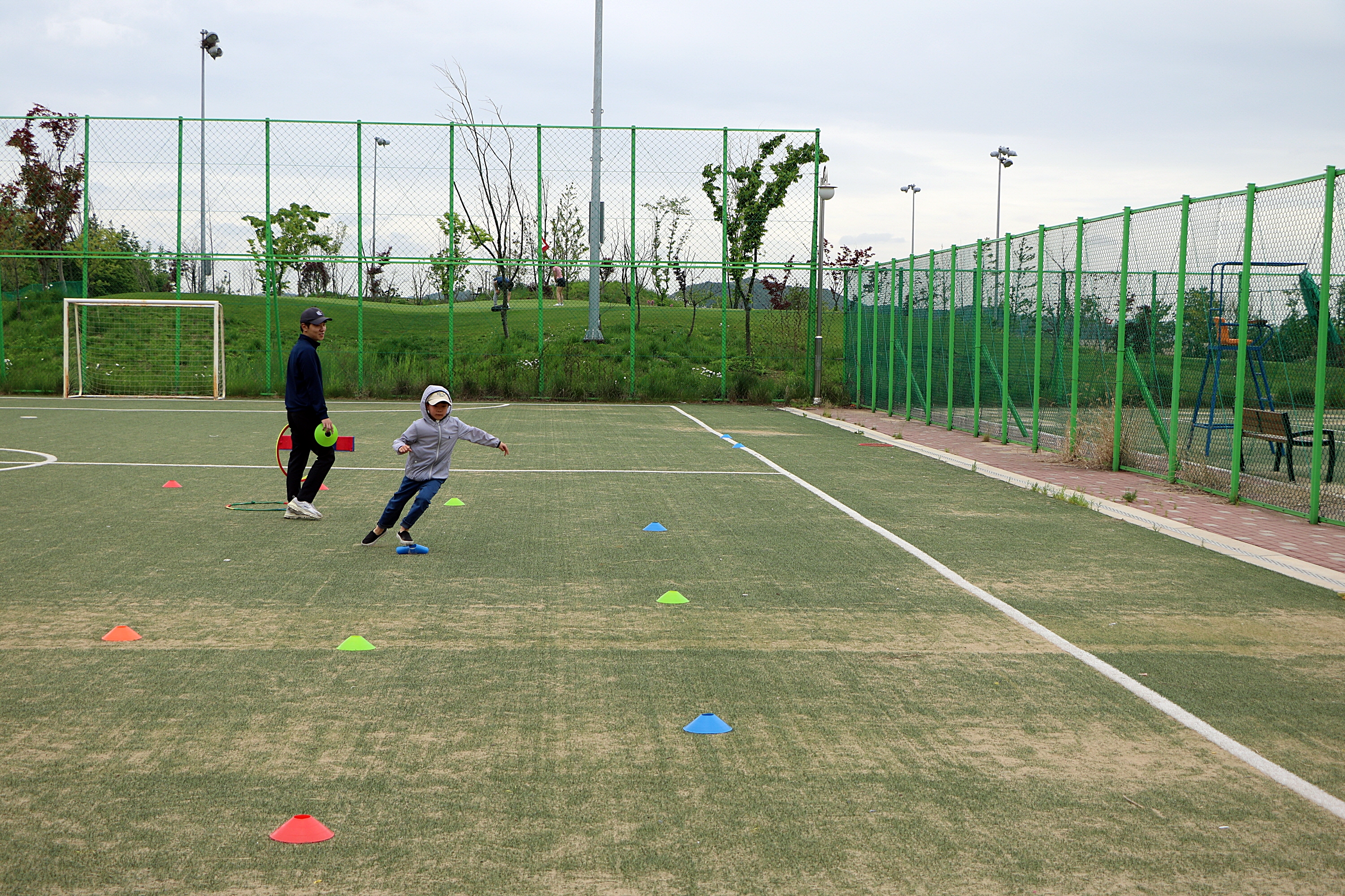 지그재그 뛰기를 하며 민첩성을 기르고 있는 아이들