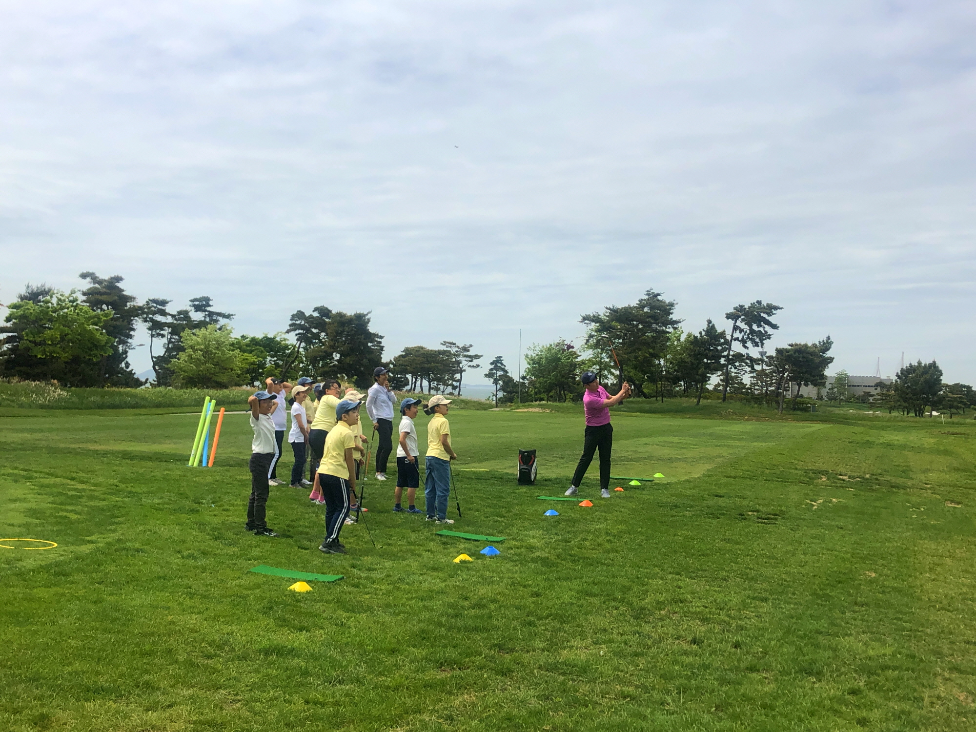 해저드를 넘겨서 타겟에 공보내기 시범을 보여주고 있는 코치님