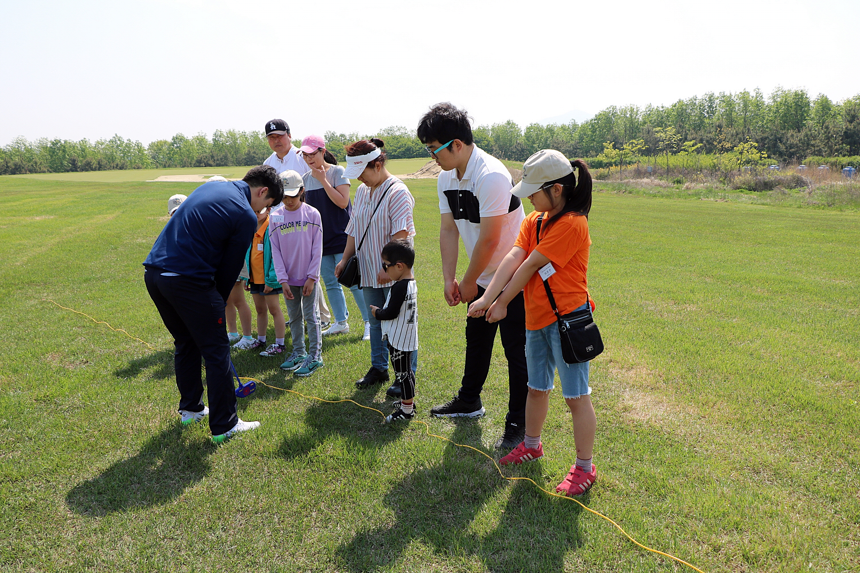 골프를 오늘 처음 접하는 일반 학생들에게 어드레스 하는 요령을 가르쳐 주고 있는 모습