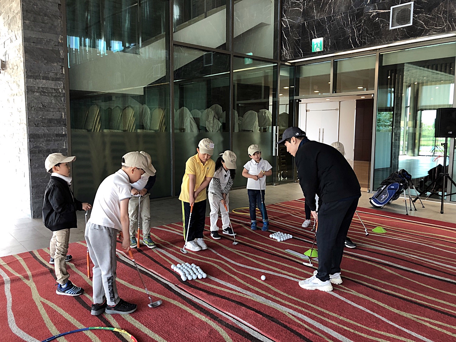 조별로 코치님께 퍼팅 레슨을 받고 있는 아이들