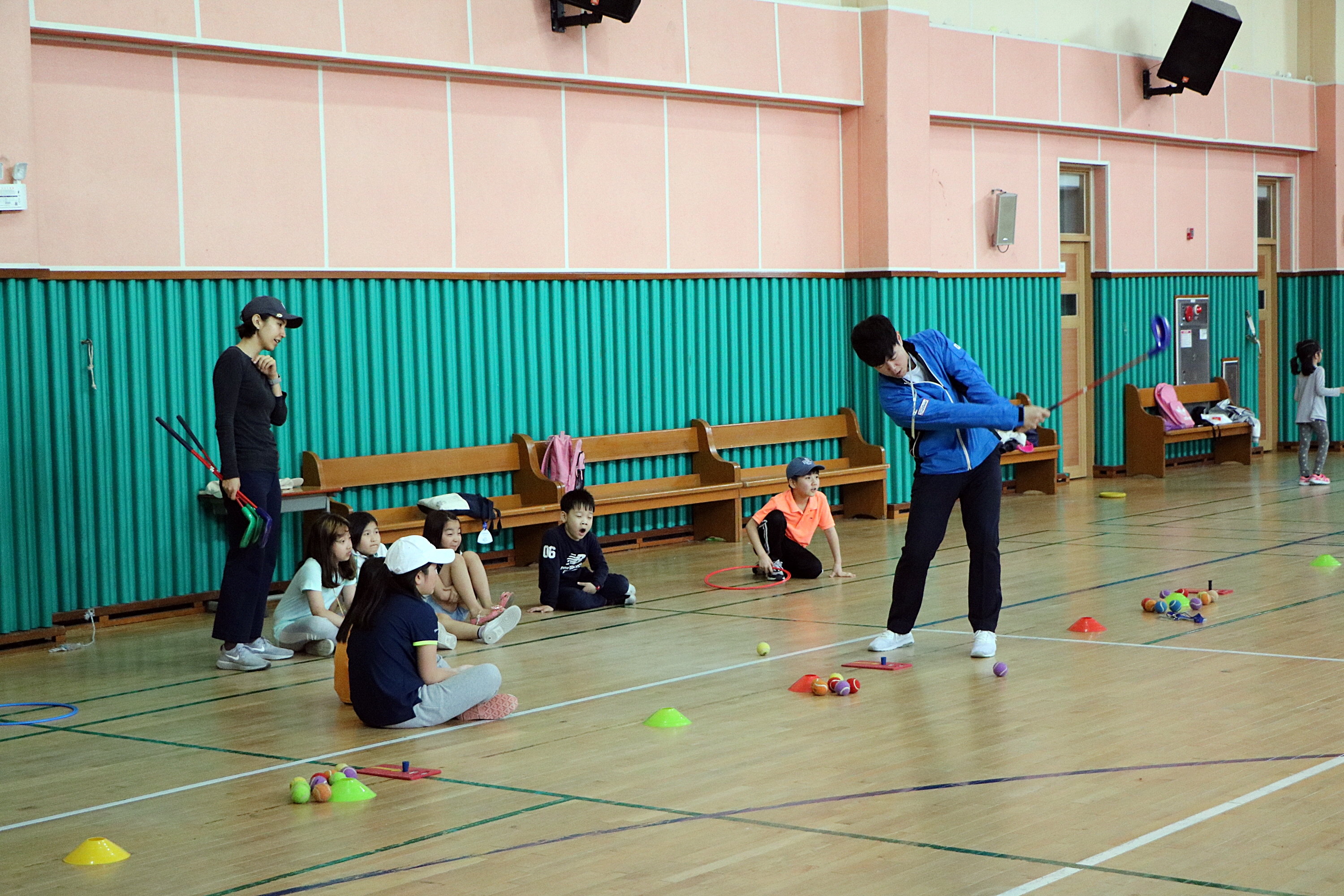 정확한 스윙 자세에 대해 시범을 보여주고 있는 코치들