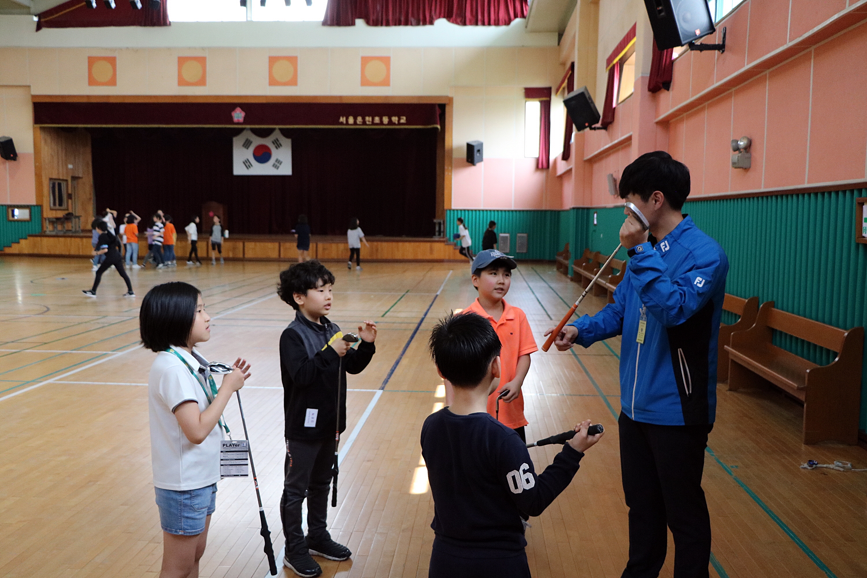 지난시간에 배운 골프클럽의 세부 명칭에 대해서 복습하고 있는 아이들