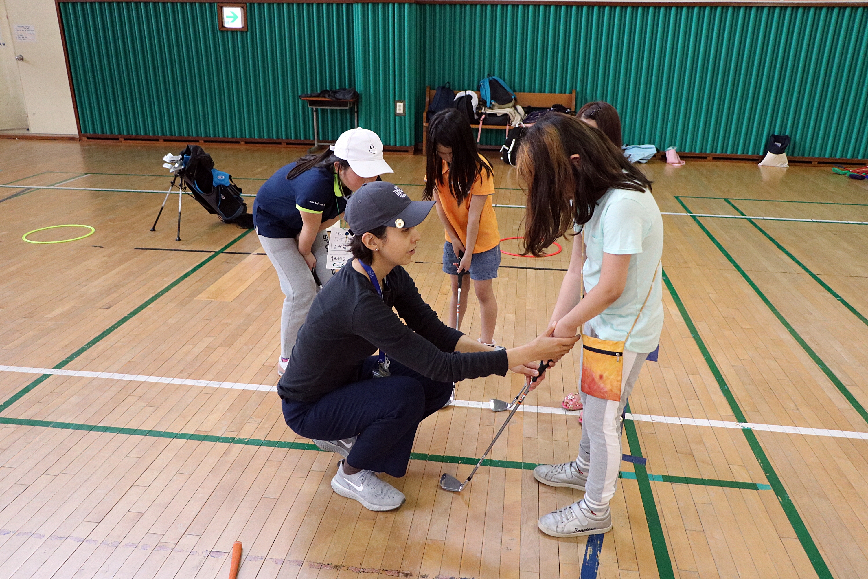골프클럽의 그립을 어떻게 잡아야 하는지에 대해 친절하게 1:1로 지도해 주고 있는 모습