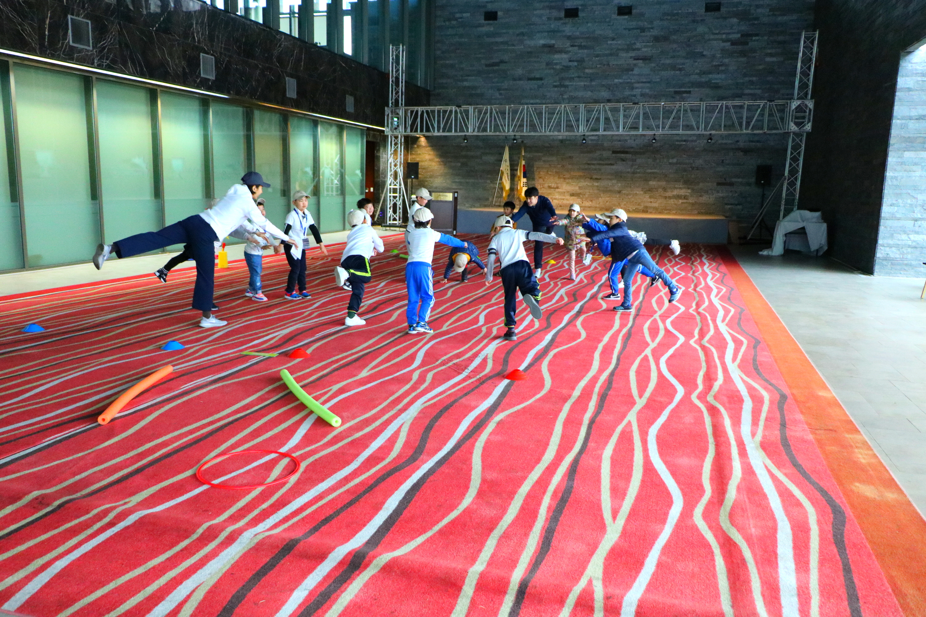 균형감각을 기르기 위한 준비운동을 하고 있는 교육생들의 모습