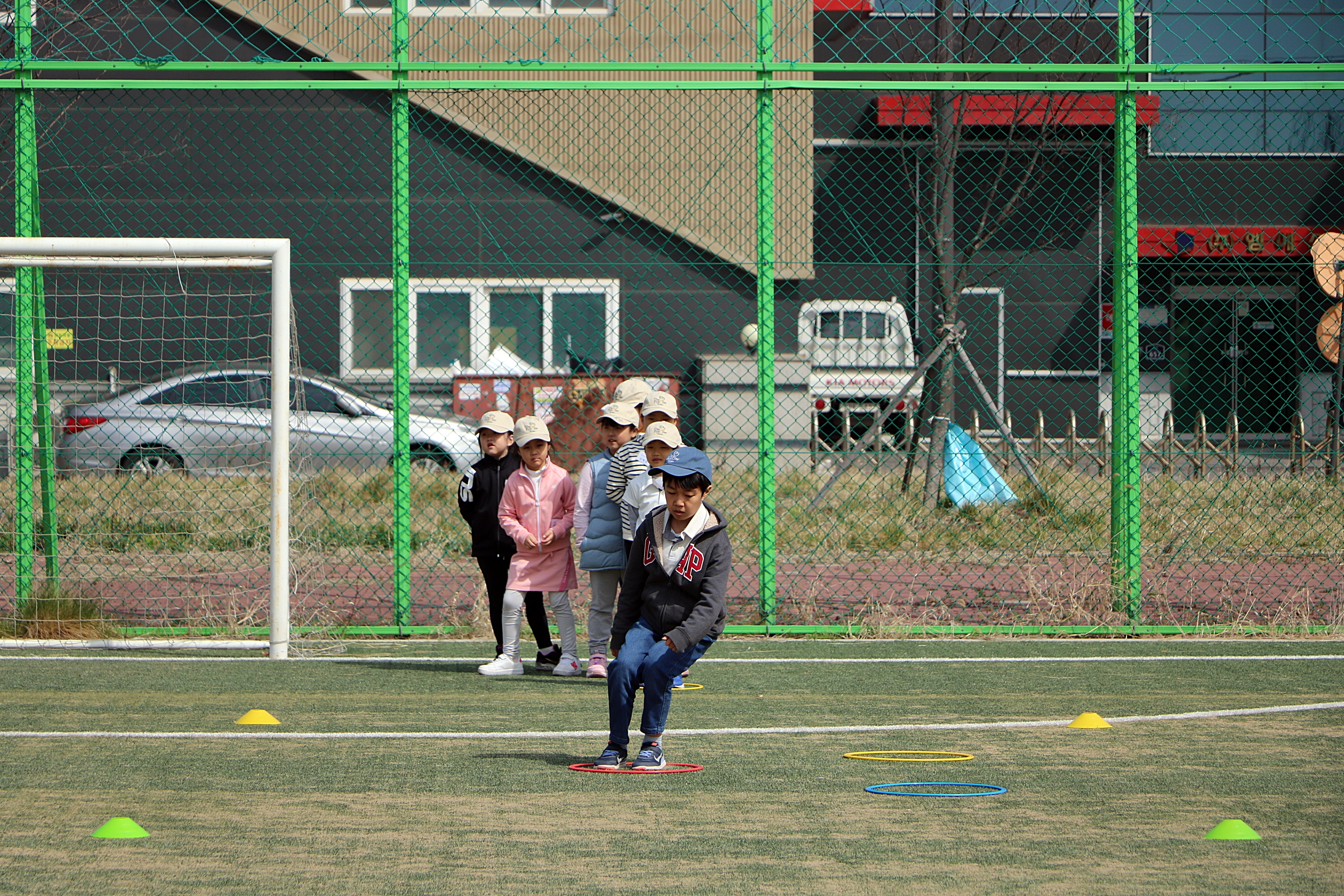 개구리 뜀뛰기를 하며 안전한 자세로 착지 중인 교육생