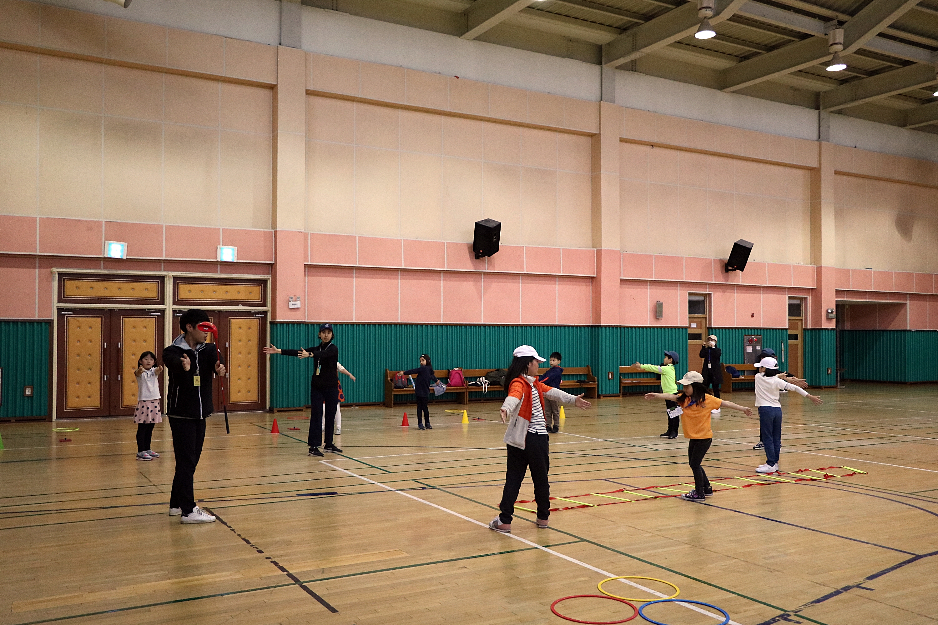 비거리를 늘이는데 가장 기본이 되는 몸통회전의 개념을 배우고 있는 아이들
