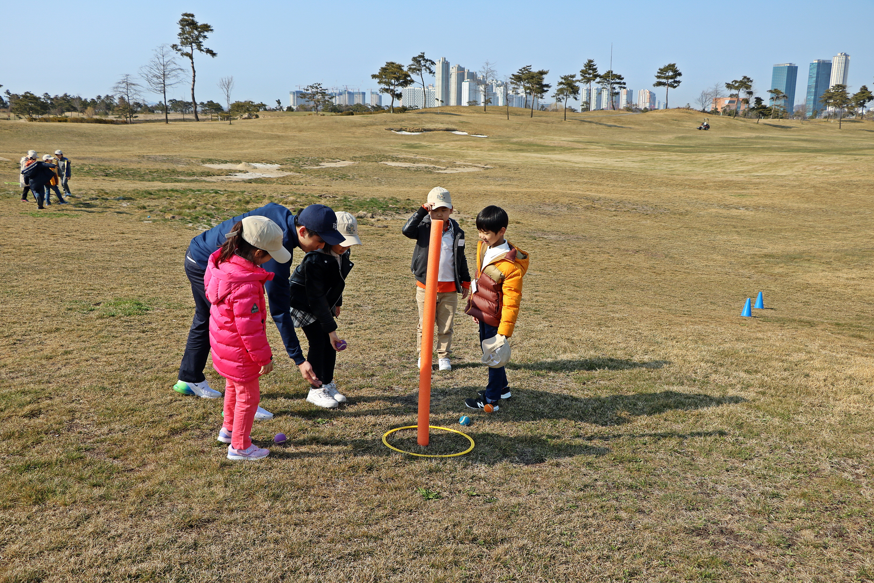 코치님께 홀인에 대한 개념을 배우고 있는 아이들