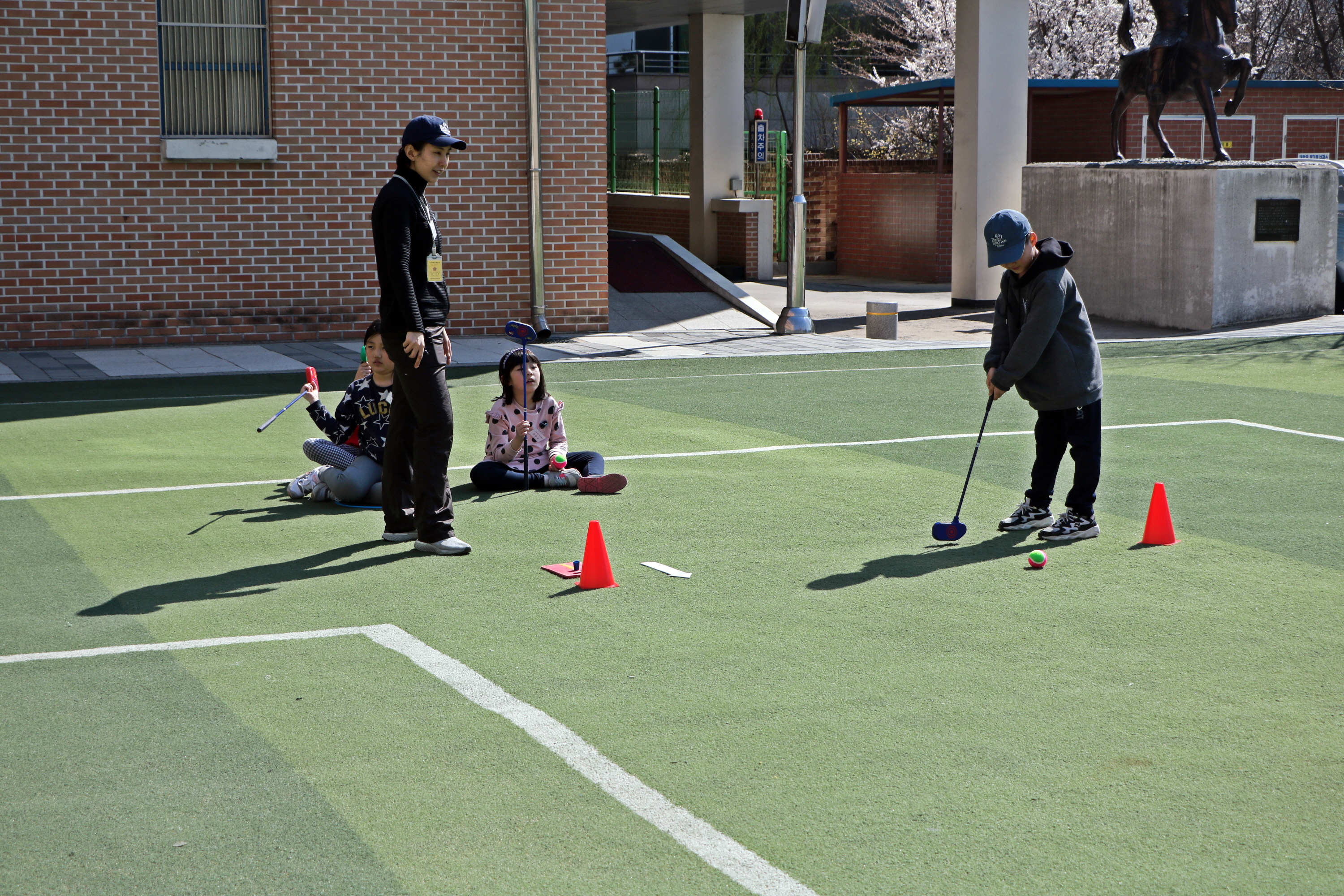 올바른 퍼팅 요령에 대해 1:1 레슨을 해주고 있는 모습