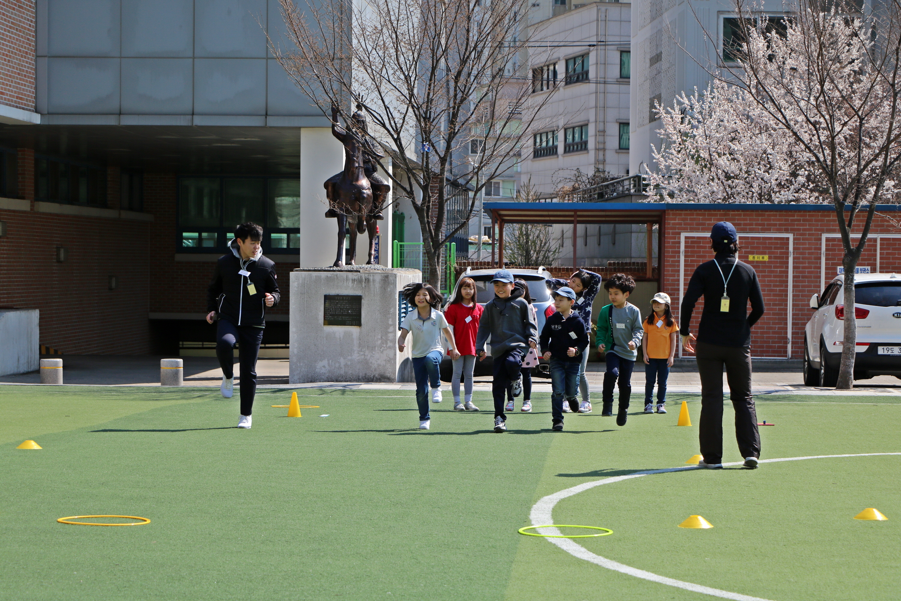 운동장에 서 있는 동상 위의 말처럼 힘차게 달리는 아이들