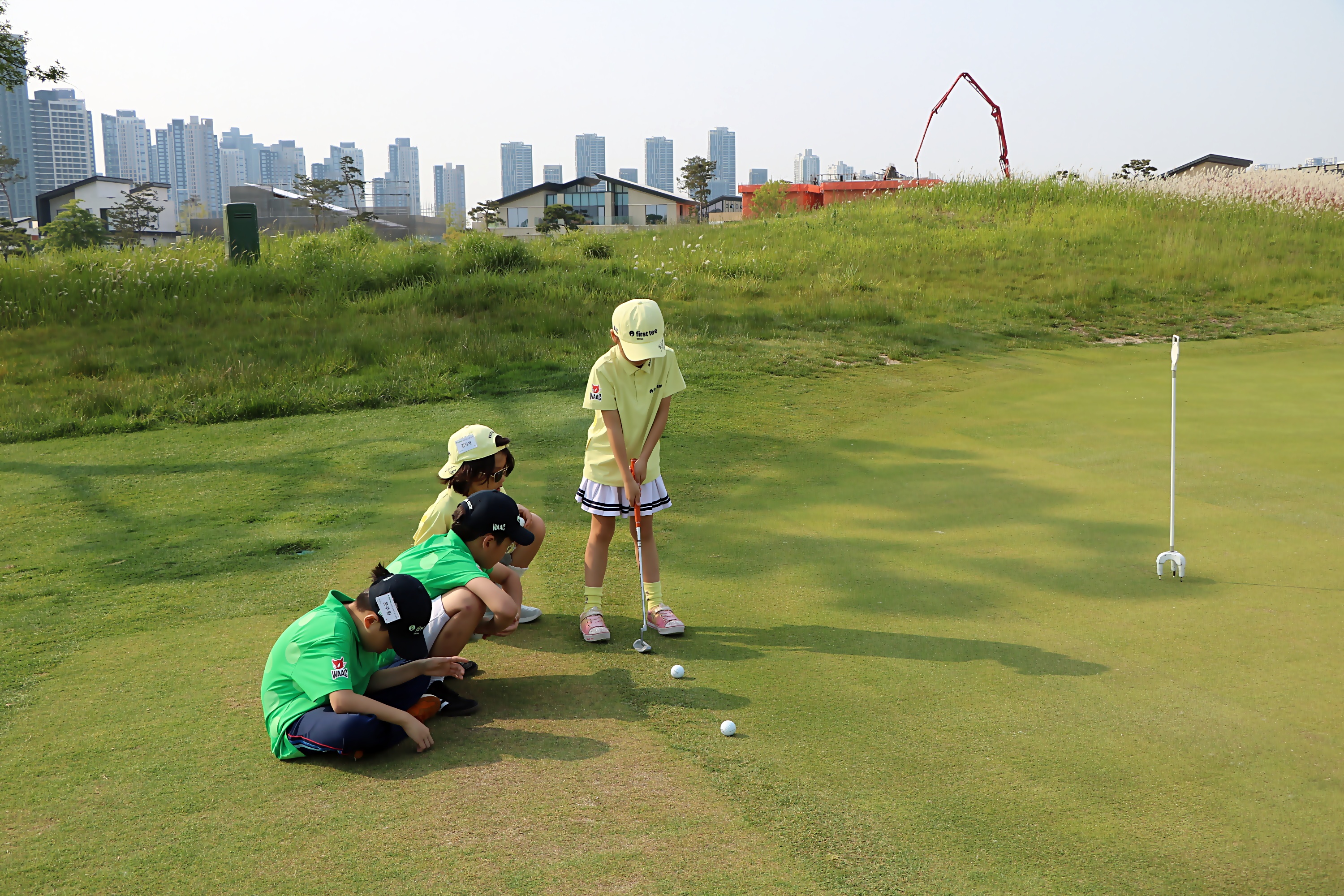 조별로 다른 친구가 어드레스 방향 등을 제대로 하는지 서로 체크해주면서 퍼팅실습을 하고 있는 모습