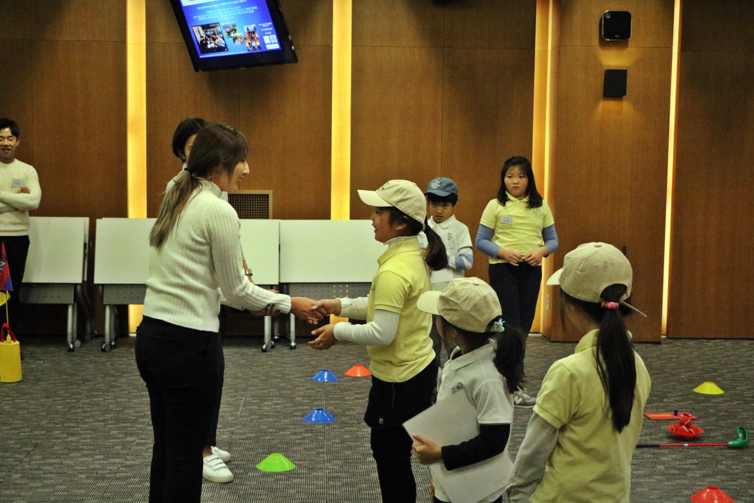 퍼팅지도에 앞서 반갑게 아이들과 인사를 나누고 있는 배선우 프로