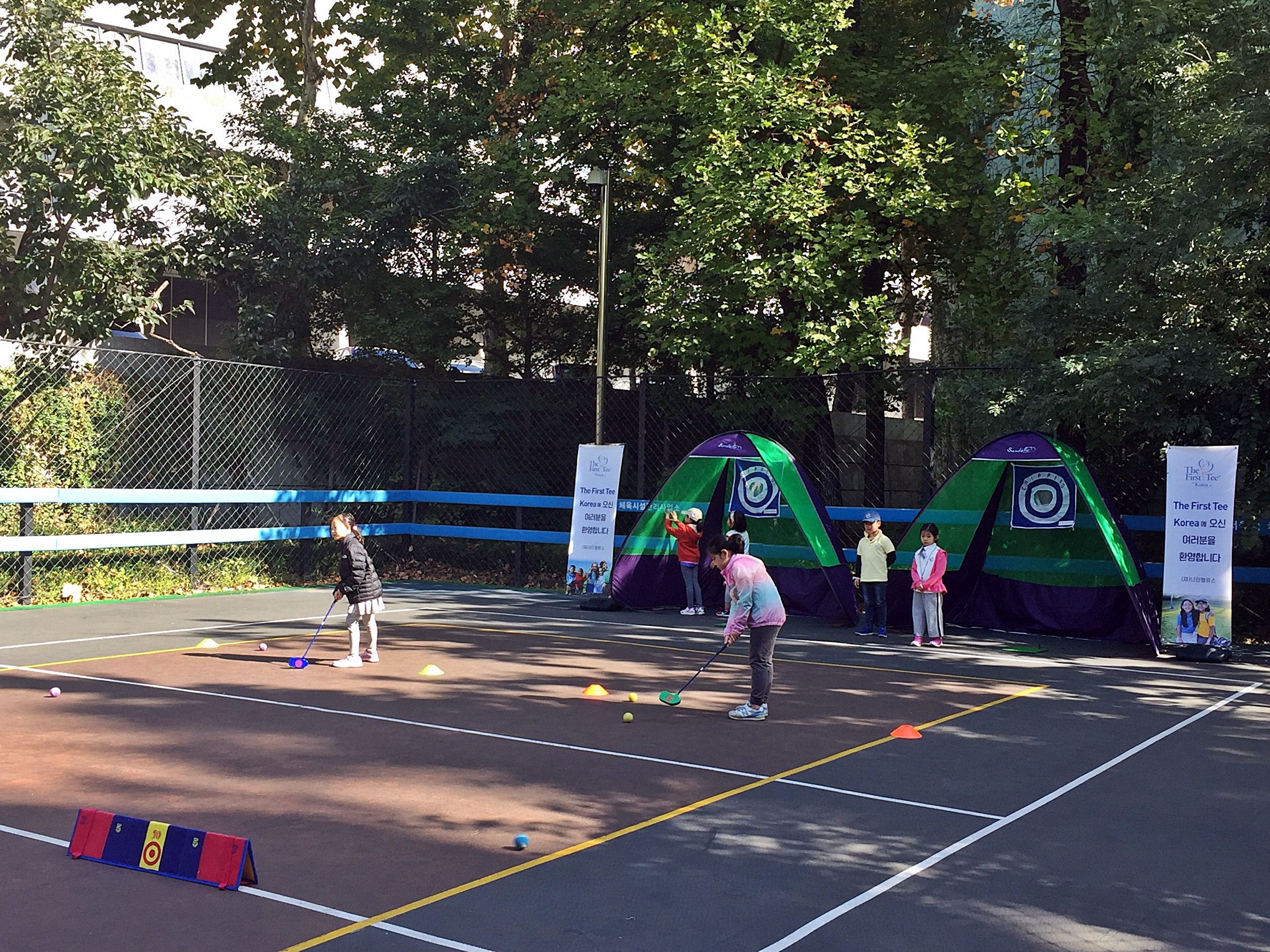 팀별 퍼팅대항전으로 가장 먼저 팀 합산 32점을 만드는 경기를 하고 있는 모습