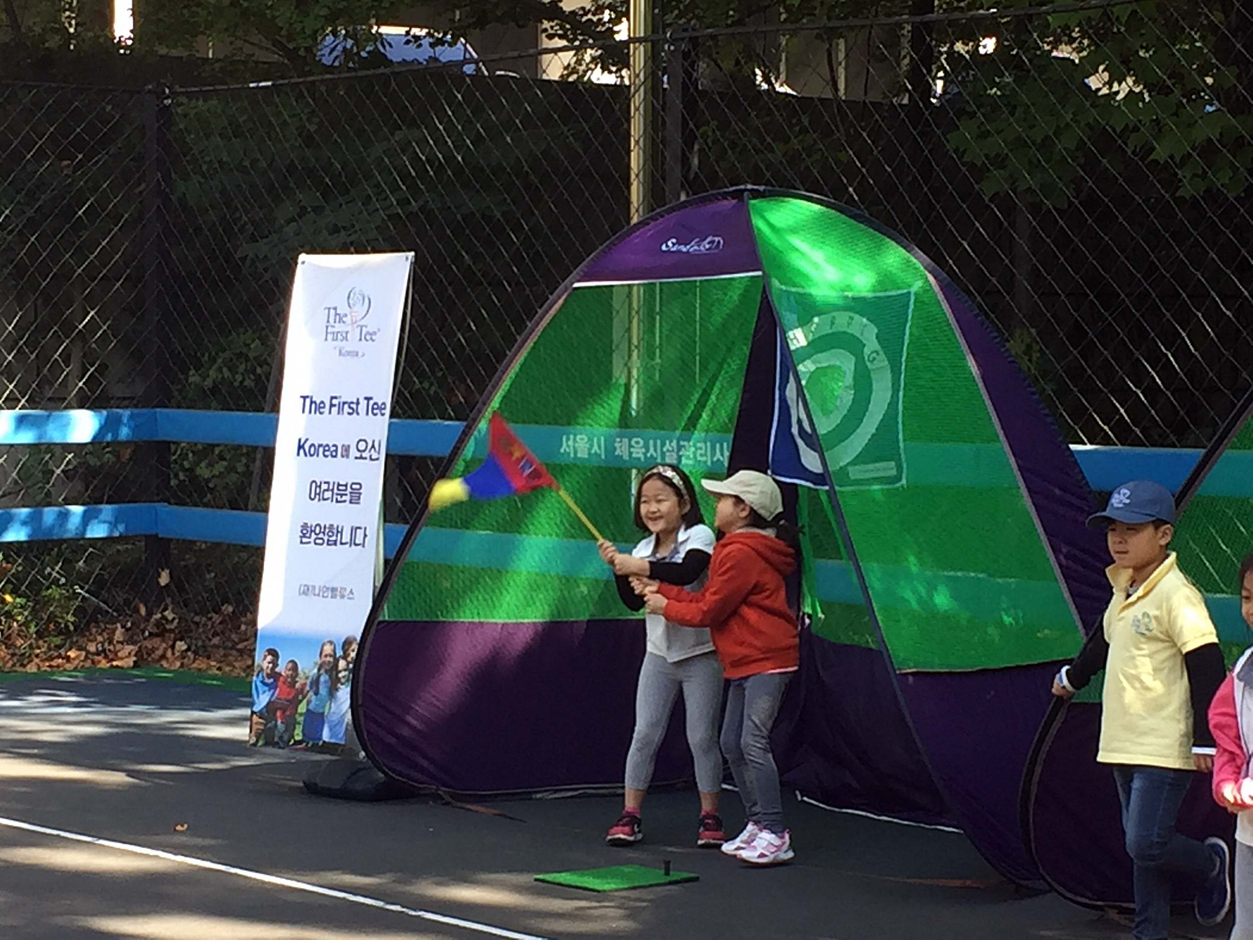가장 먼저 1위를 기록한 팀에게 준 깃발을 휘두르며 기뻐하는 아이들