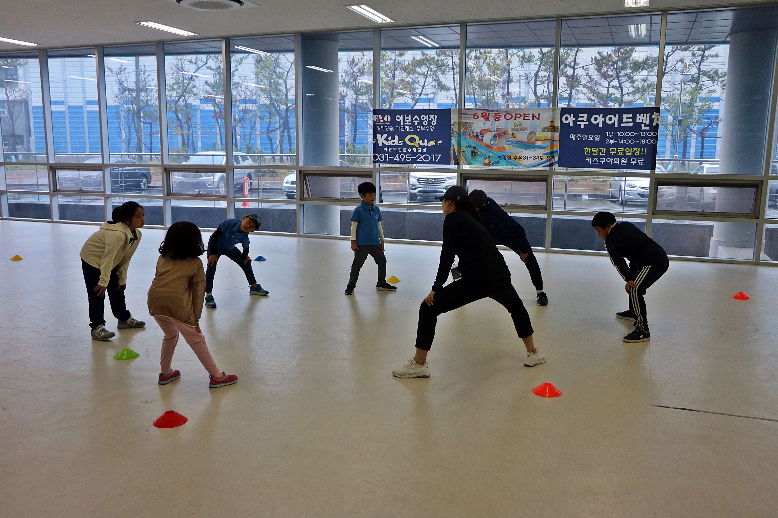 코치님과 함께 스트레칭을 하면서 가볍게 몸을 풀고 있는 아이들