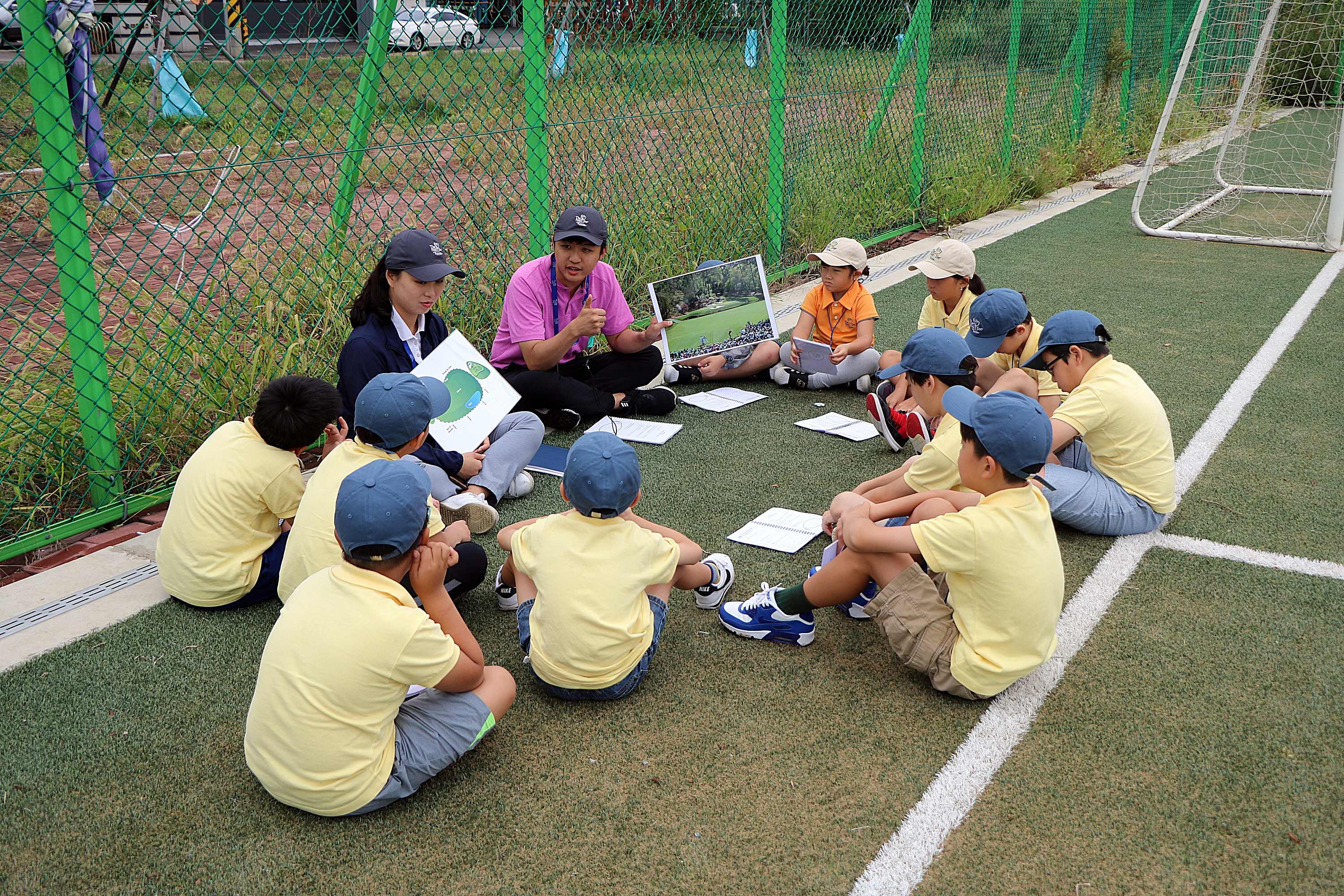 교육생들에게 골프코스 가운데 페어웨이에 대한 설명을 해주고 있는 코치들