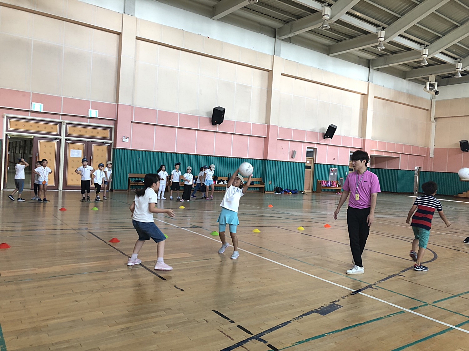 2인 1조로 옆으로 달려가면서 공주고 받기를 하면서 몸을 풀고 있는 아이들