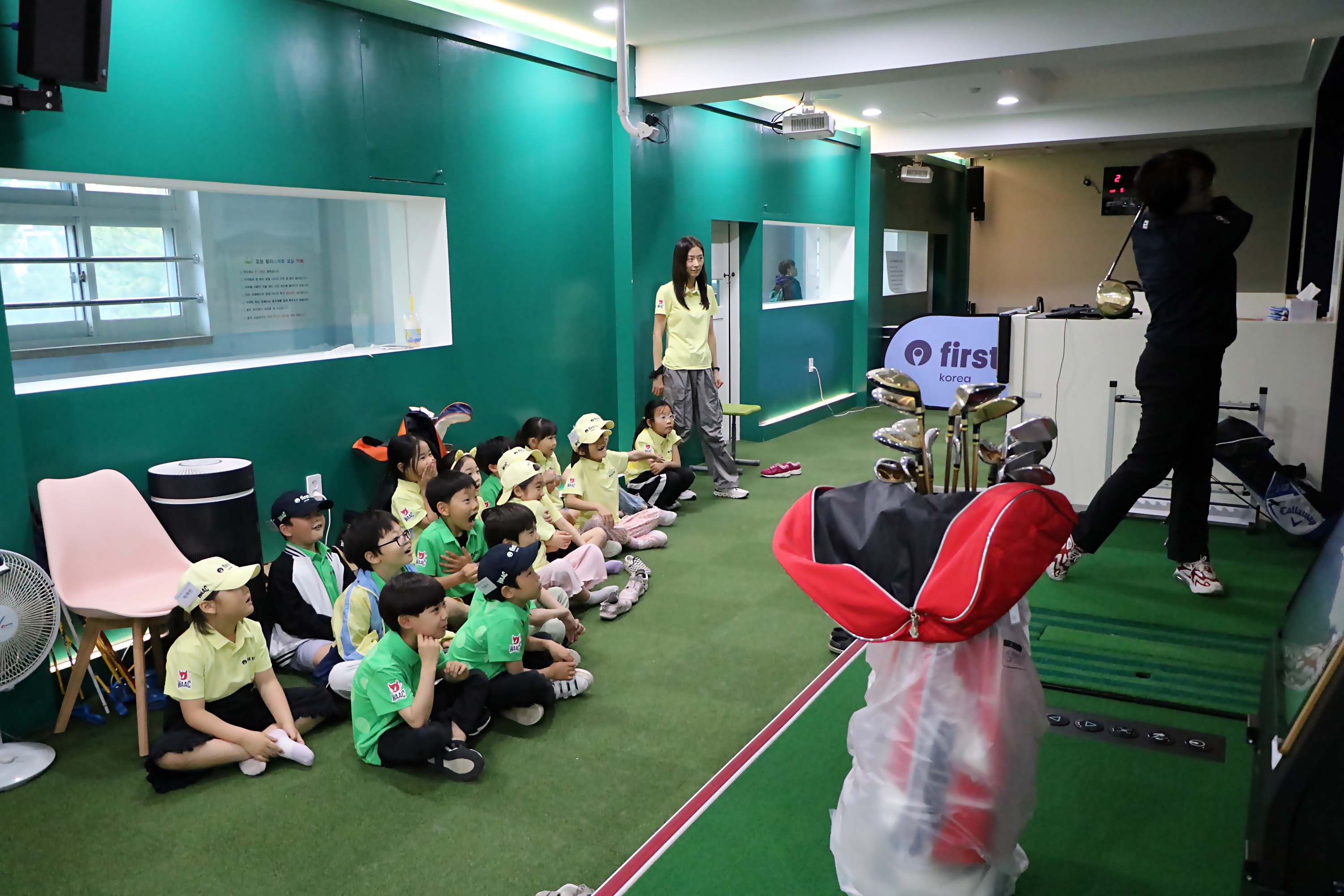 코치님의 호쾌한 드라이버샷 시범을 보며 놀라워 하는 아이들