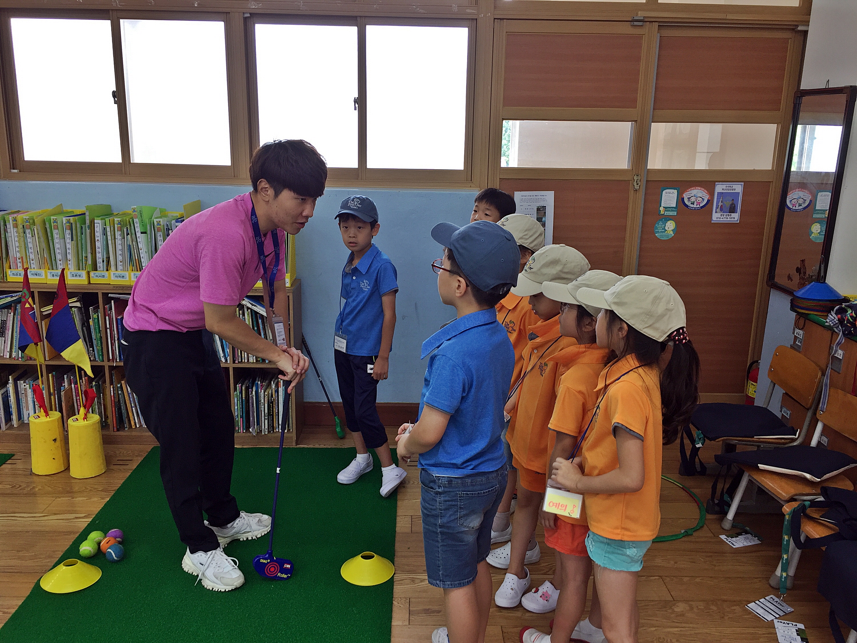 본격적인 골프 실습에 앞서 코치님께 조별로 퍼트하는 요령에 대해 설명을 듣고 있는 아이들