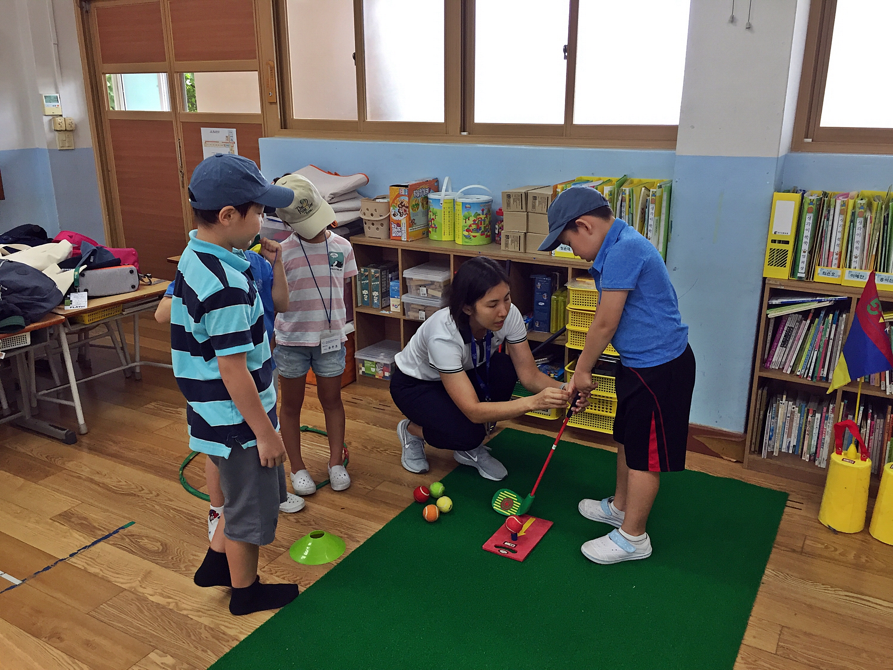 스윙하기 전 그립 잡는법과 어드레스 동작에 대해 1:1로 자세히 지도해 주고 있는 코치