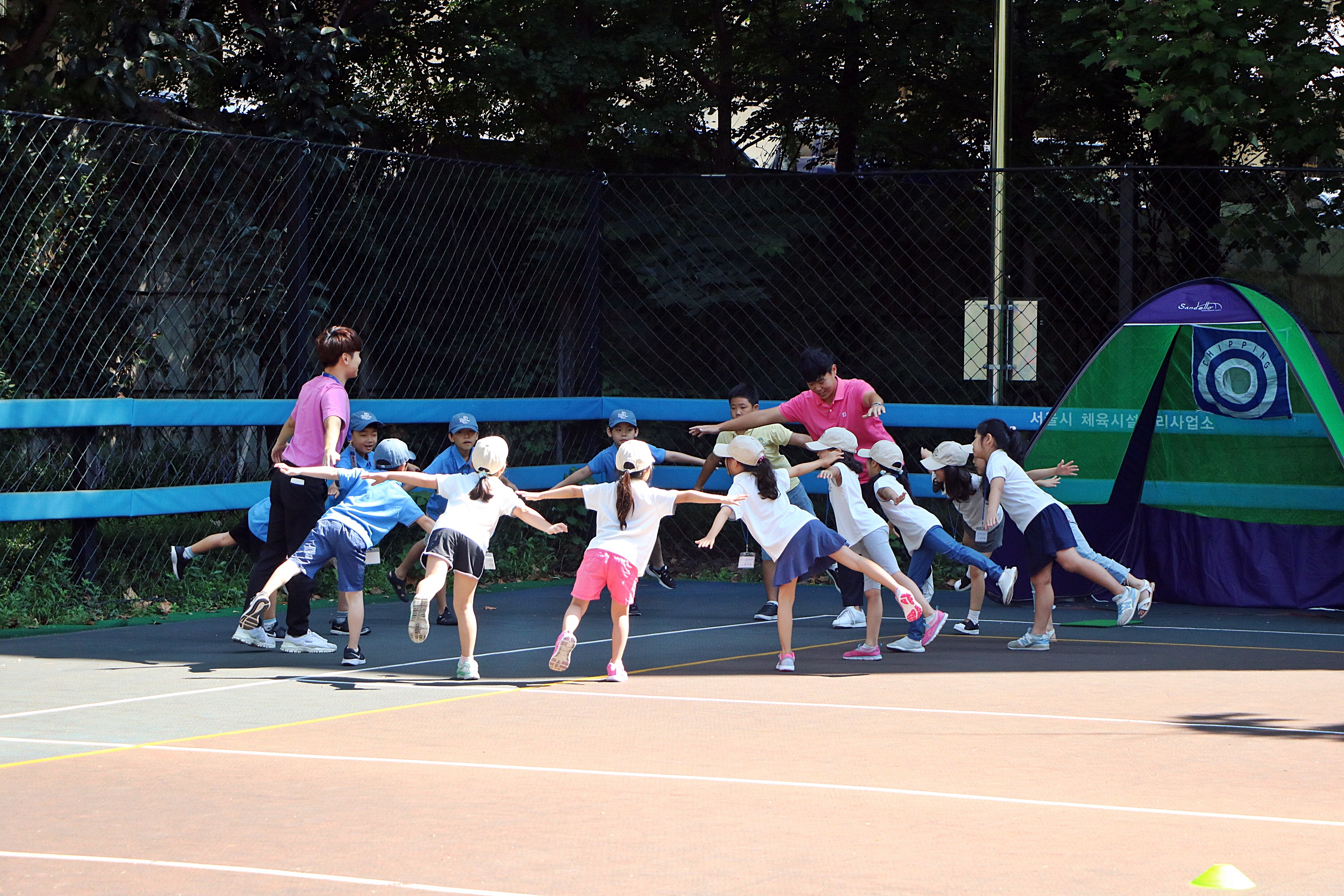 코치님을 따라 스트레칭을 따라 하고 있는 아이들