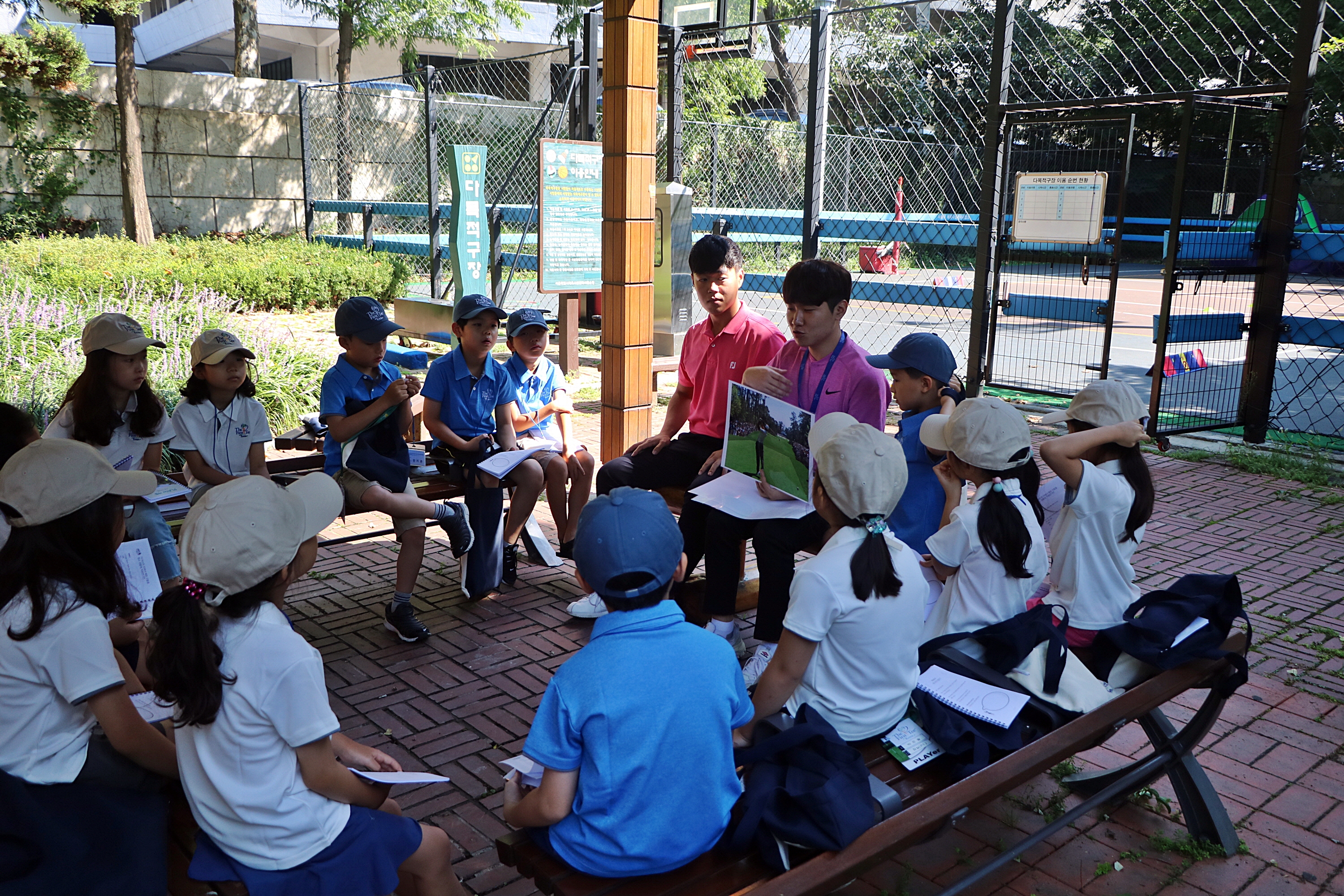 교육생들에게 골퍼가 지켜야 할 예의에 대해서 설명해주고 있는 코치들