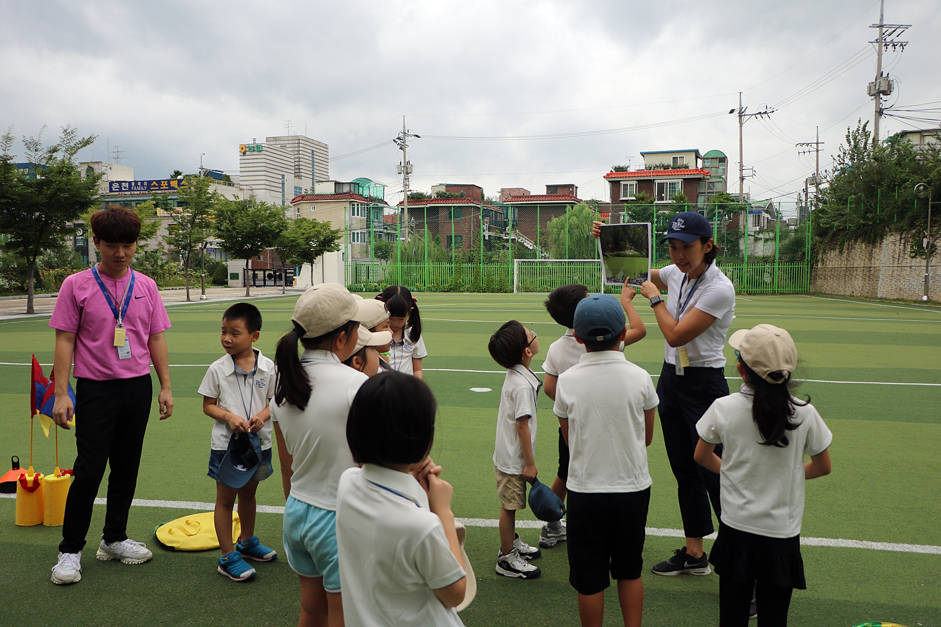 교육생들의 이해를 높이기 위해 사진 자료로 골프코스에 대해 설명 중인 코치