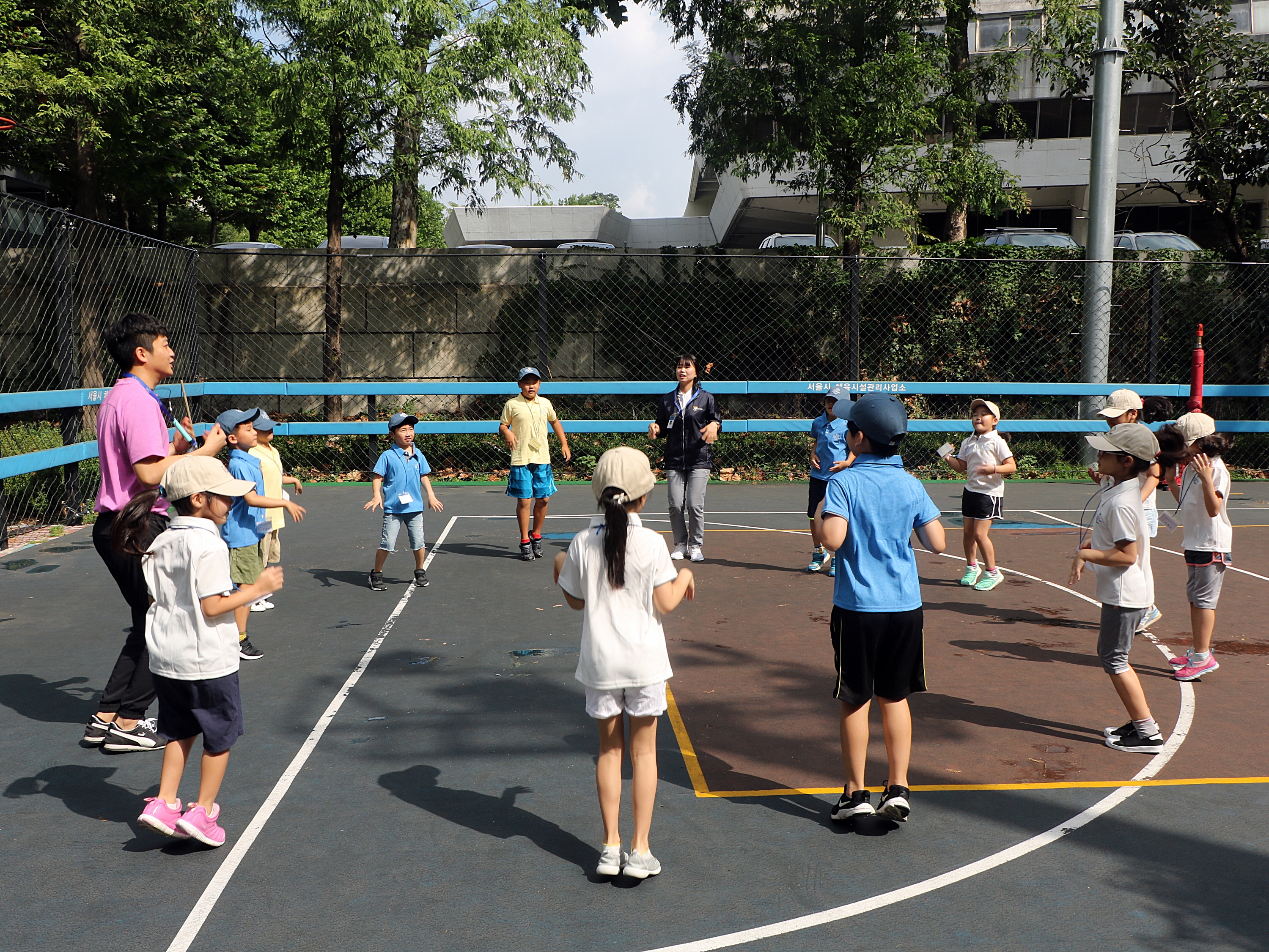 코치님과 함께 가볍게 몸풀기를 하고 있는 아이들